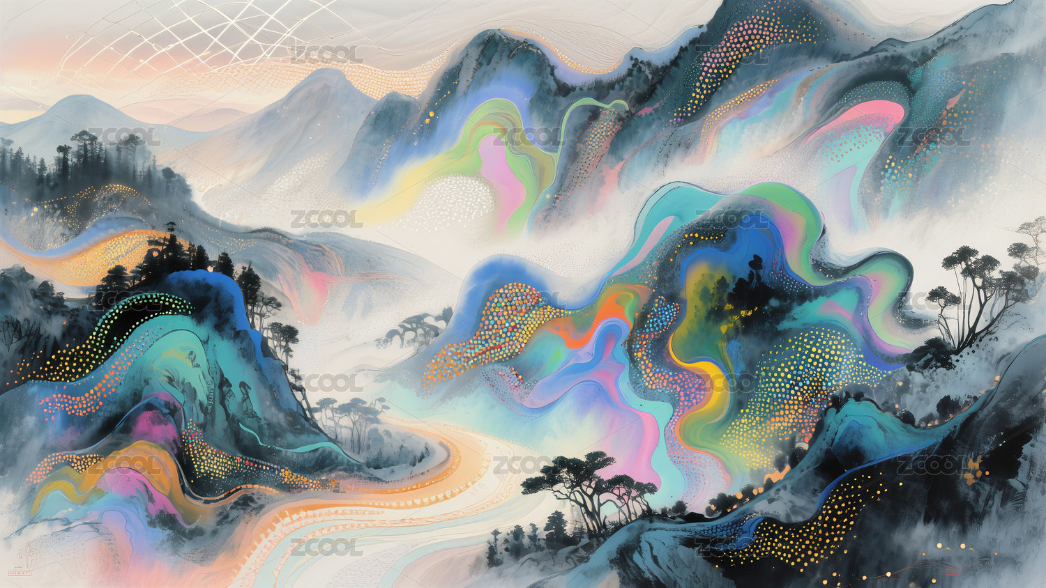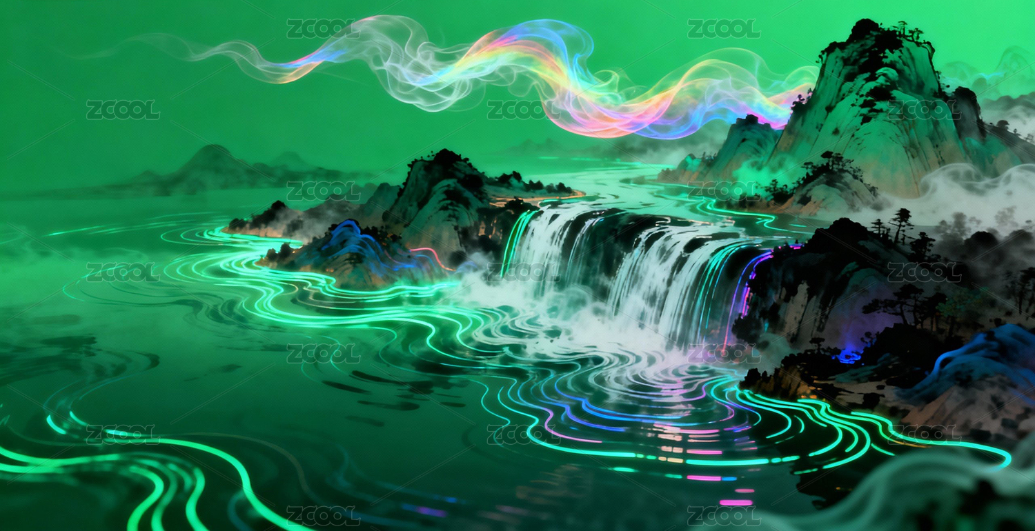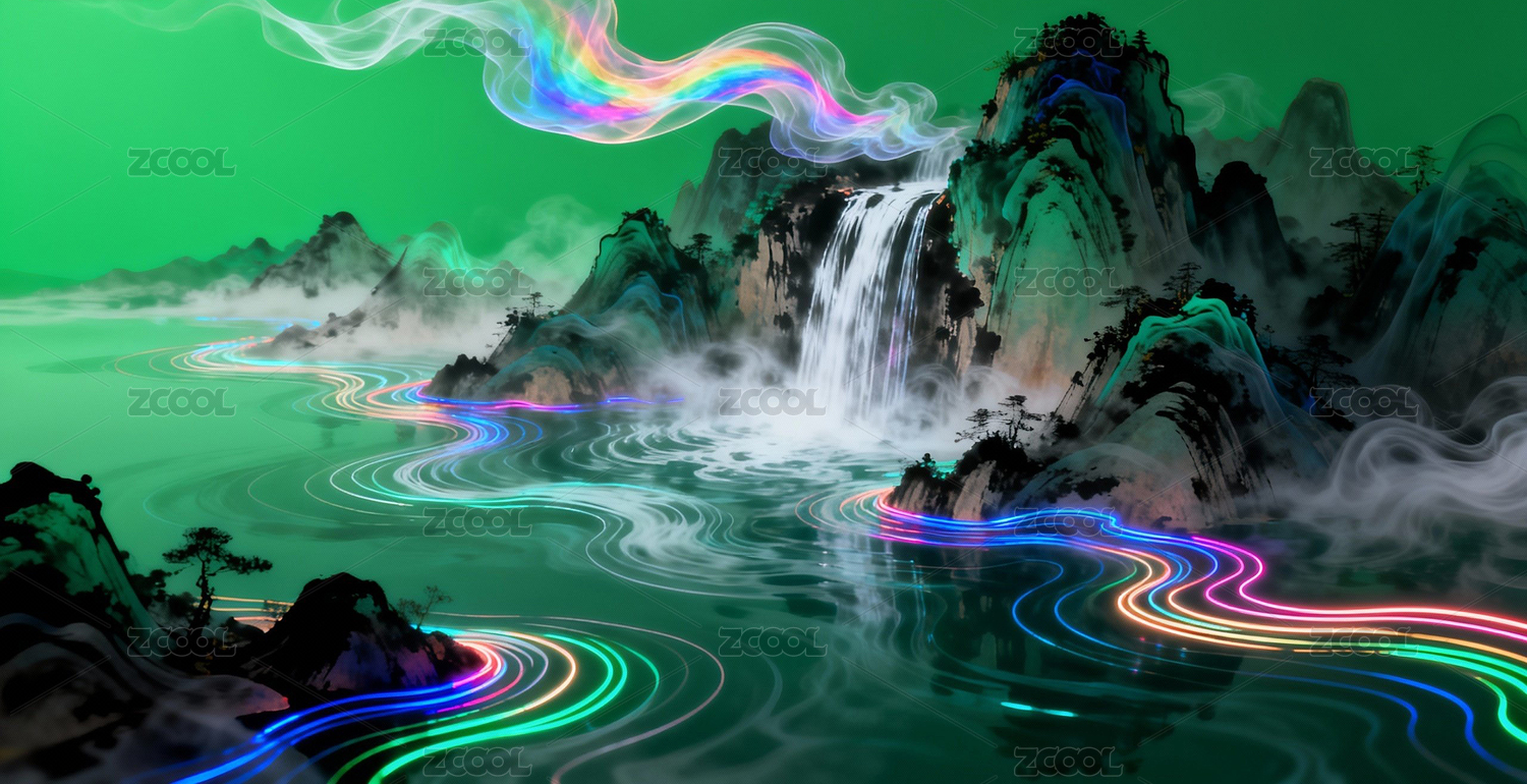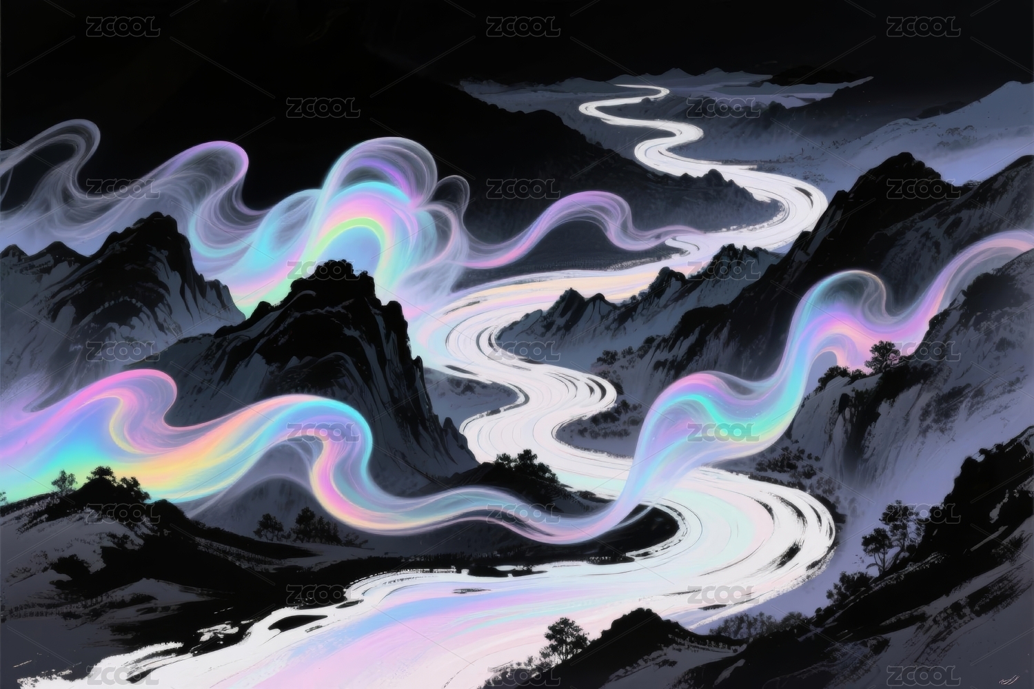 主视觉,炫彩,云烟,梦幻,山水,场景,色彩,渐变,山峦,河流