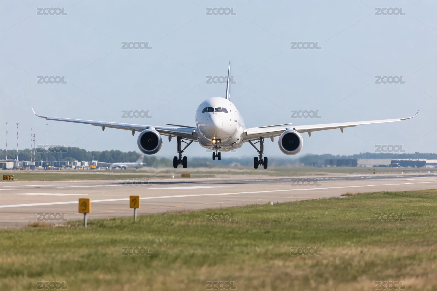 一架飞机从跑道上起飞背景是晴朗的天空云层