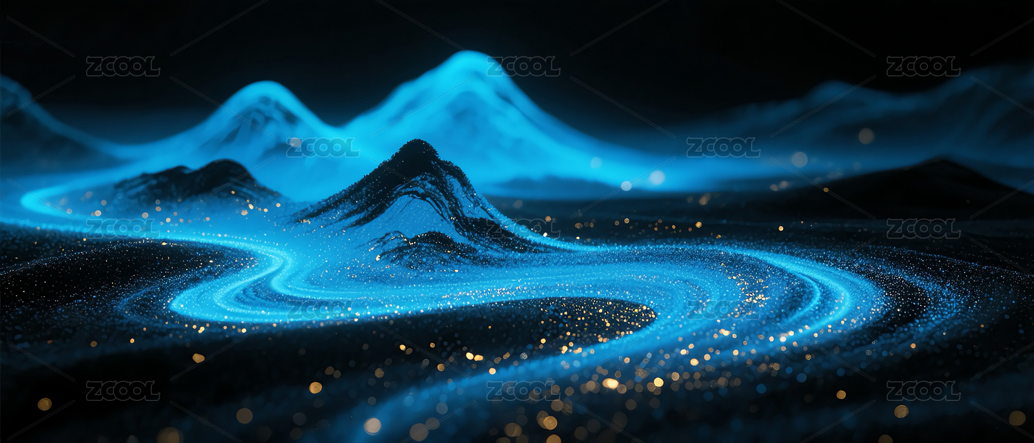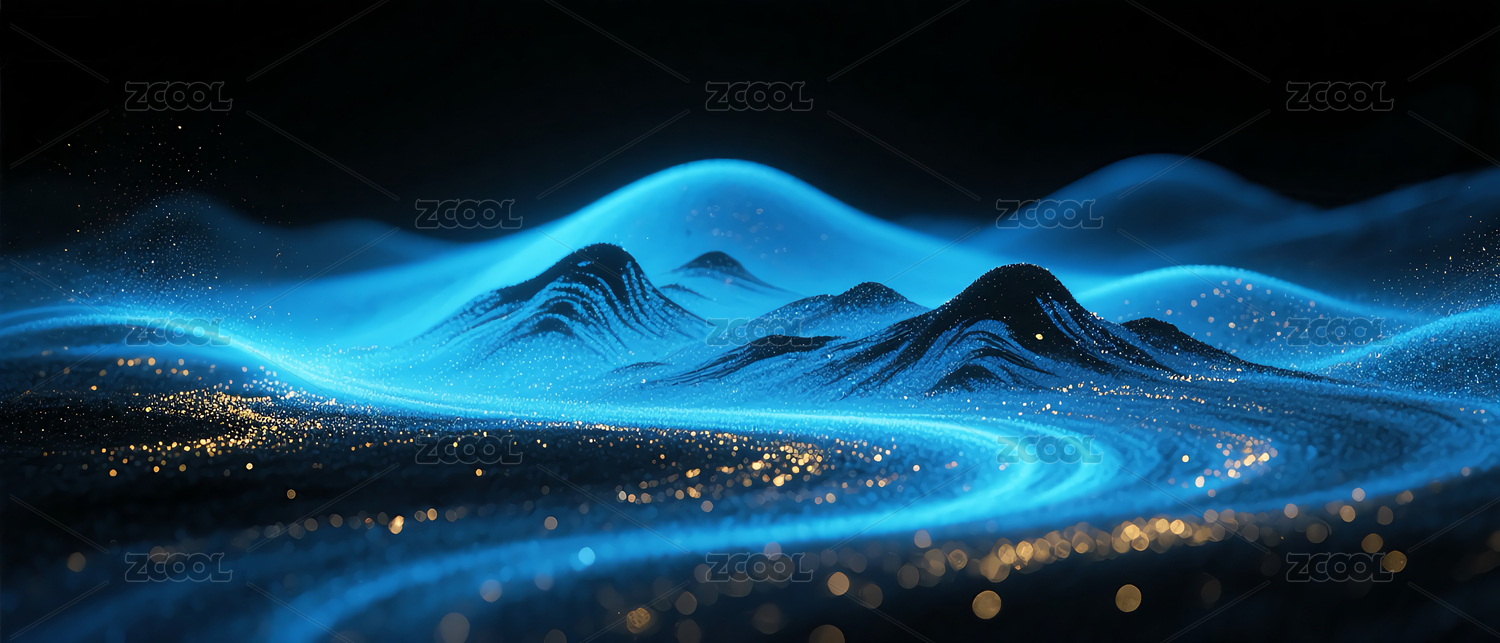 蓝光粒子波浪与山峦