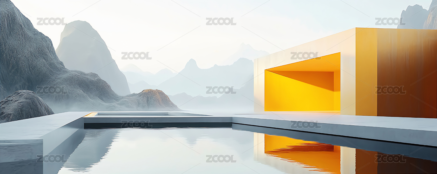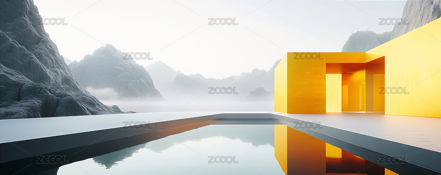建筑,三维,场景,天空,地形,水,游泳池,背景,黄色,光影