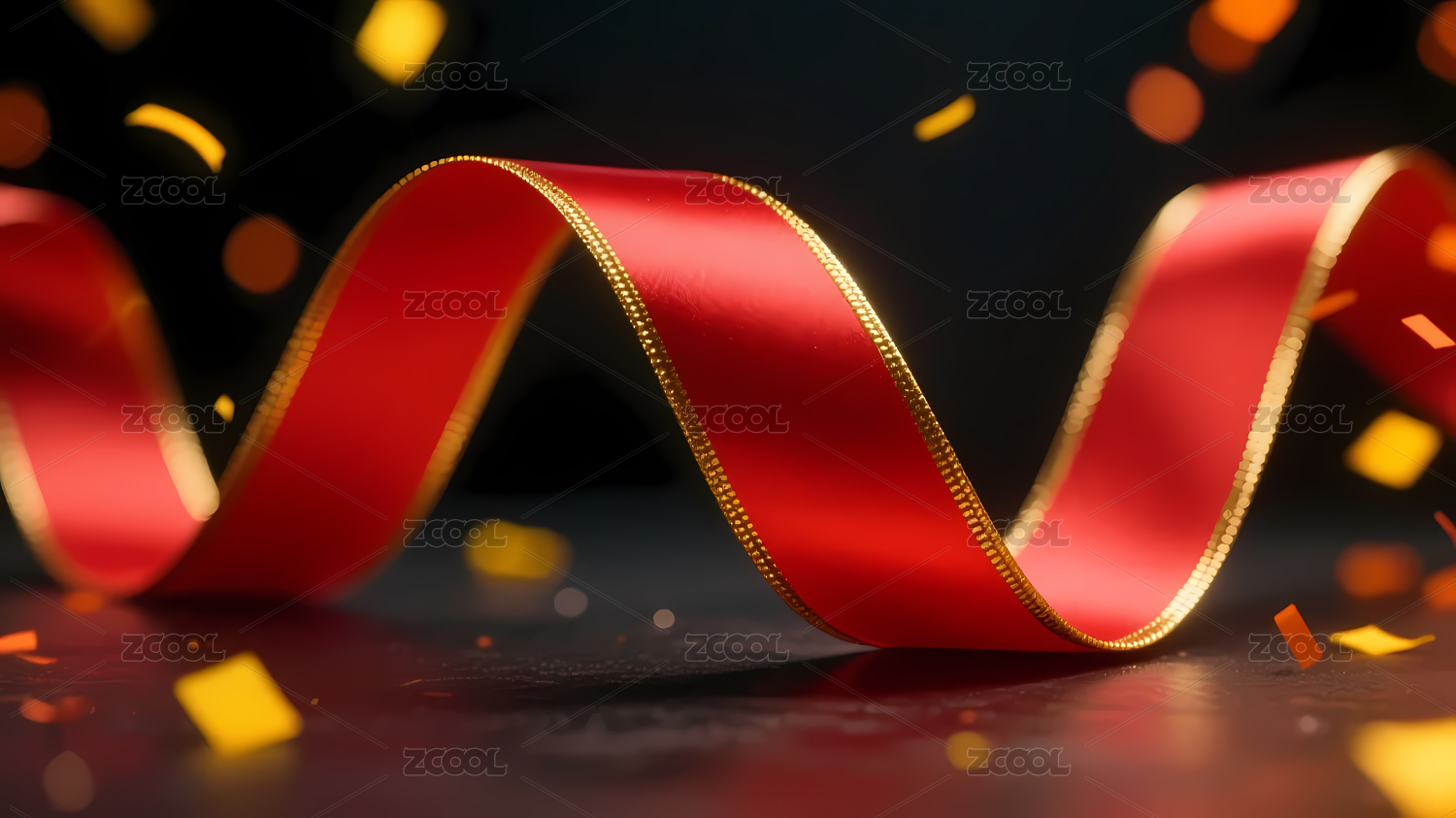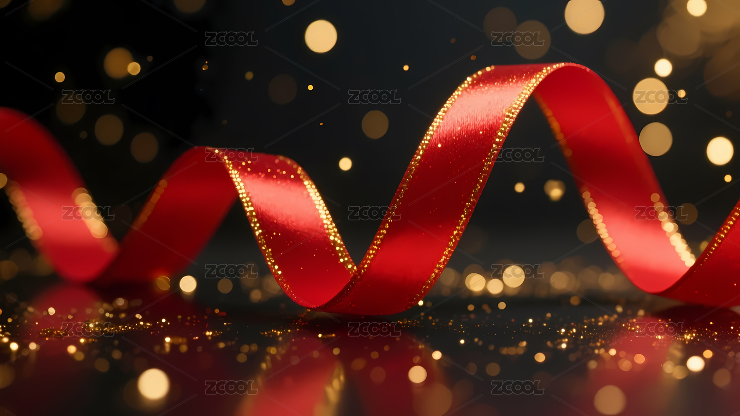 红色丝带在金色光斑背景上飘动