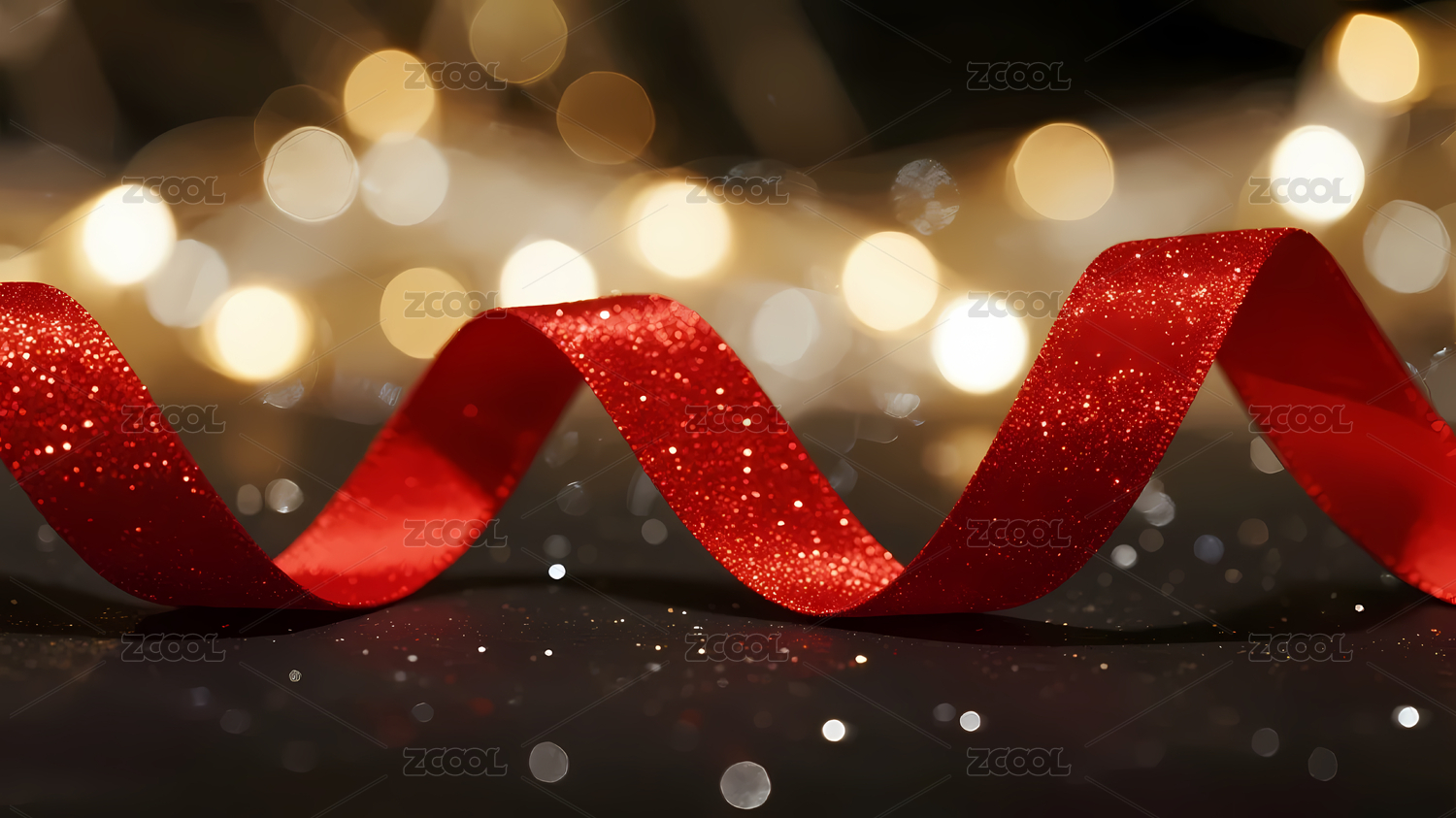 红色丝带金色光斑背景