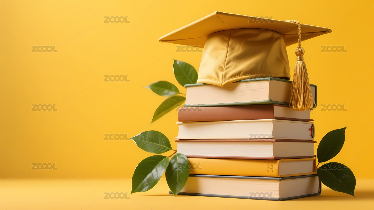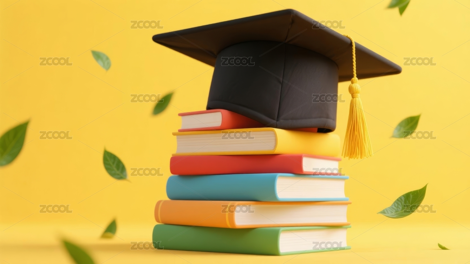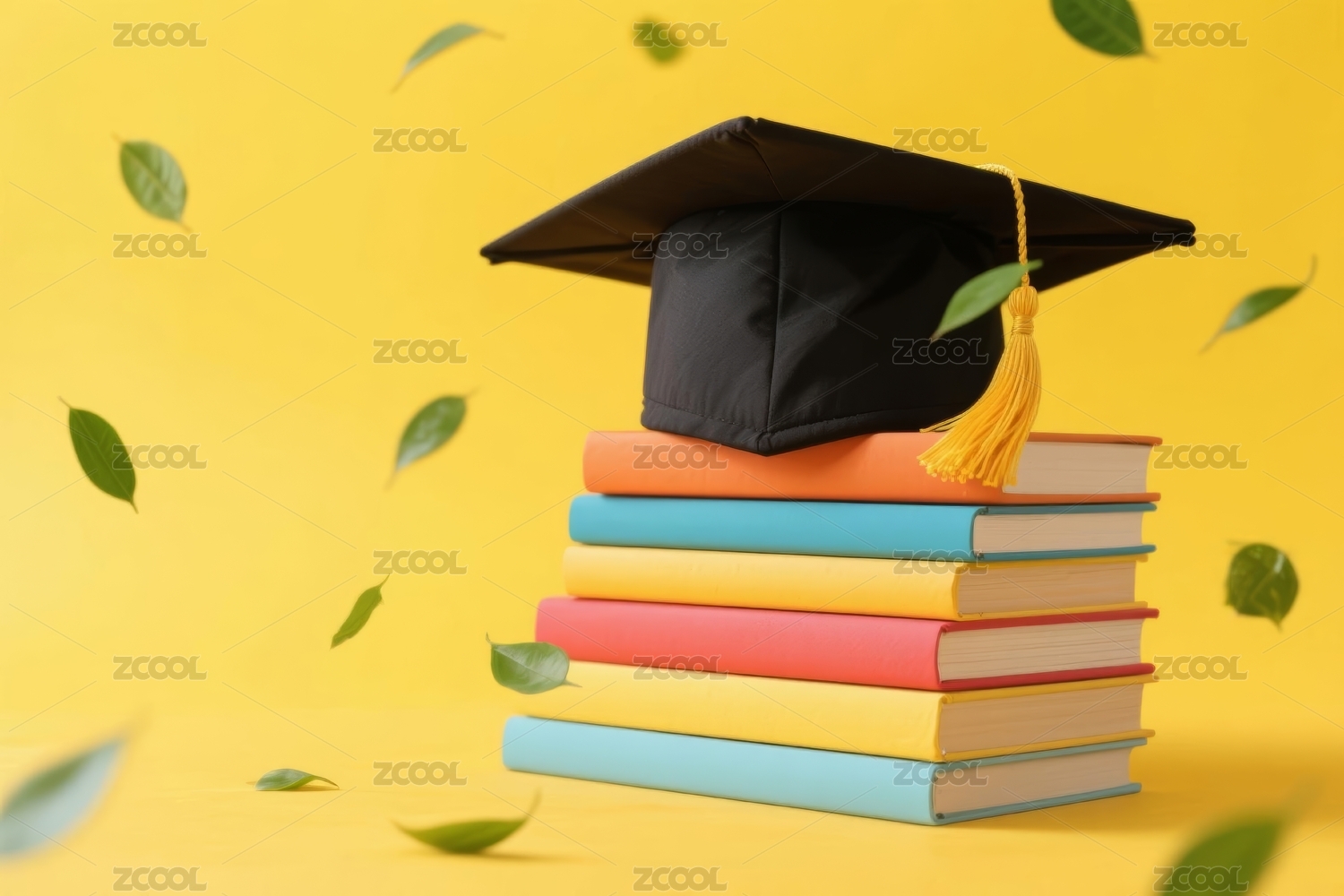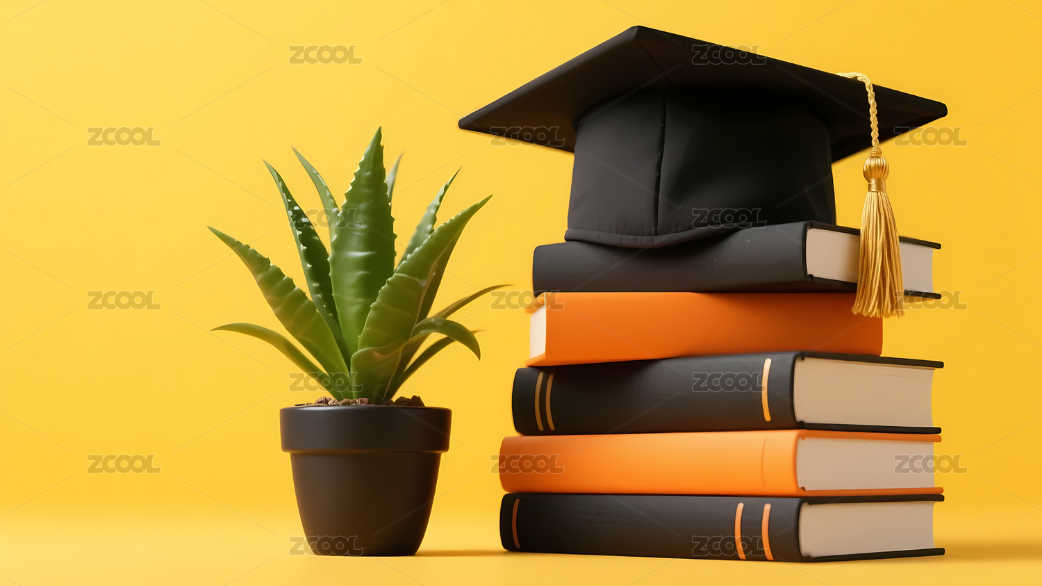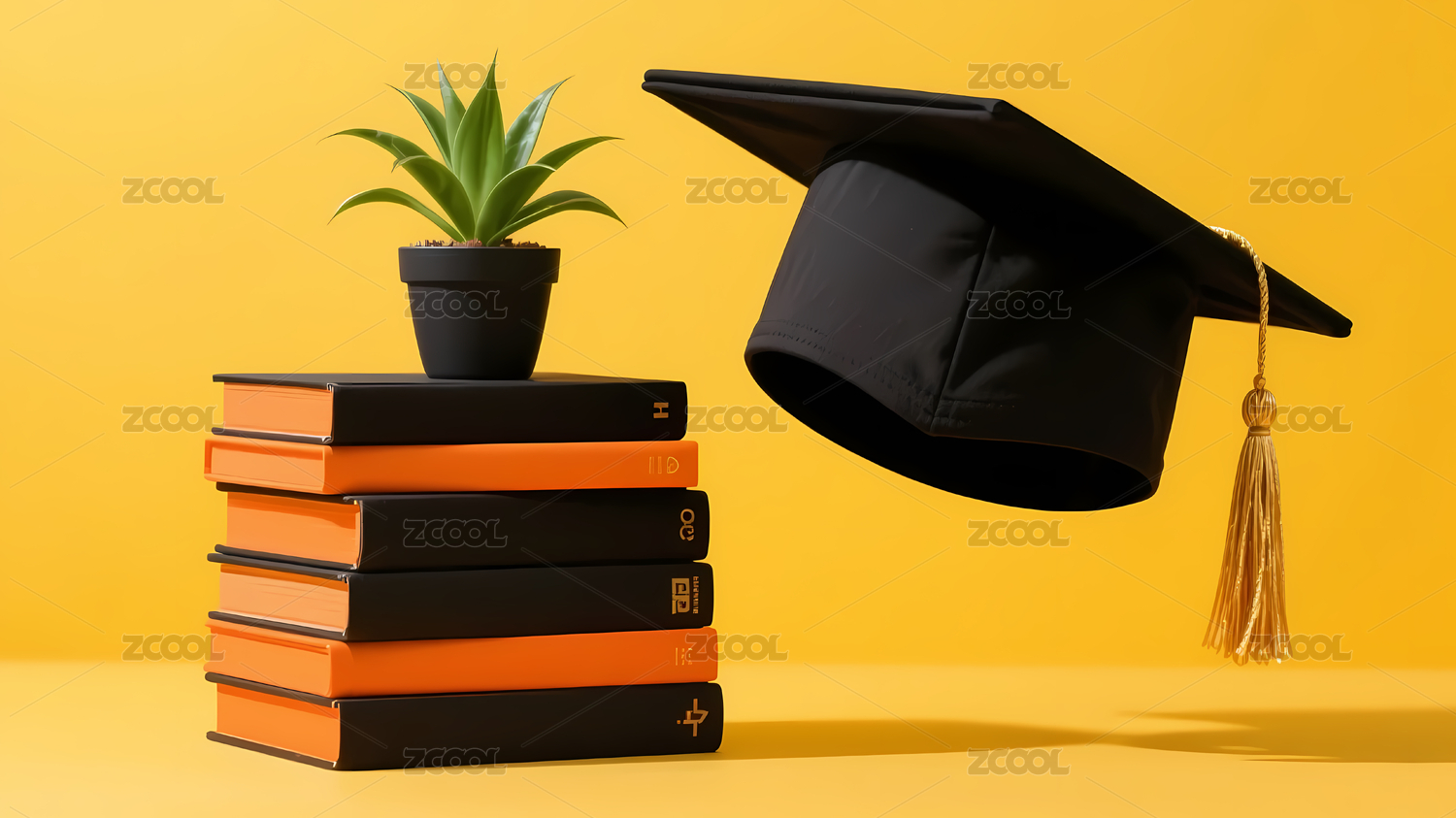 橙色,背景,主体,黑色,绿色,黄色,毕业帽,书籍,植物
