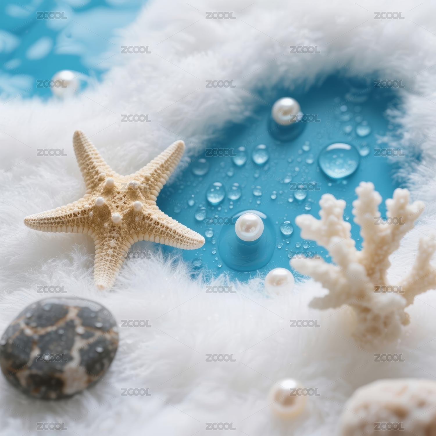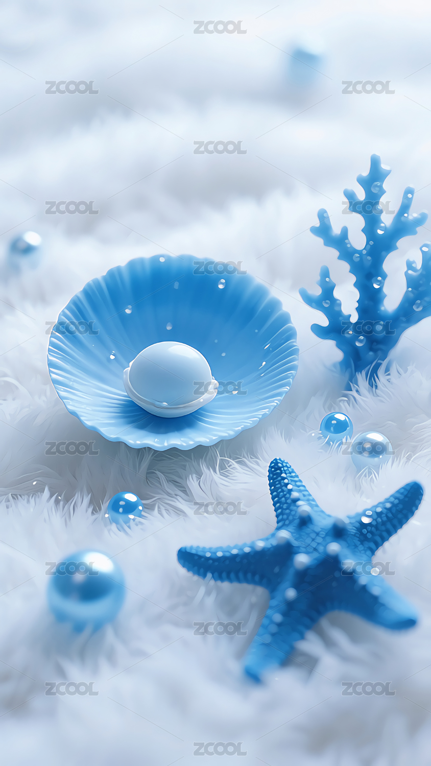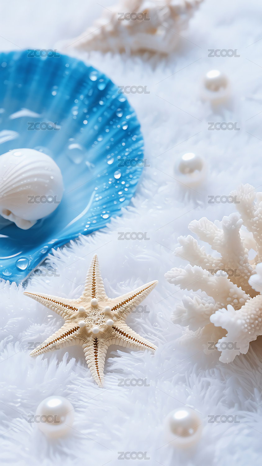 梦幻,花边,海滩,毛绒,蓝色,贝壳,海星,白色,唯美,风景