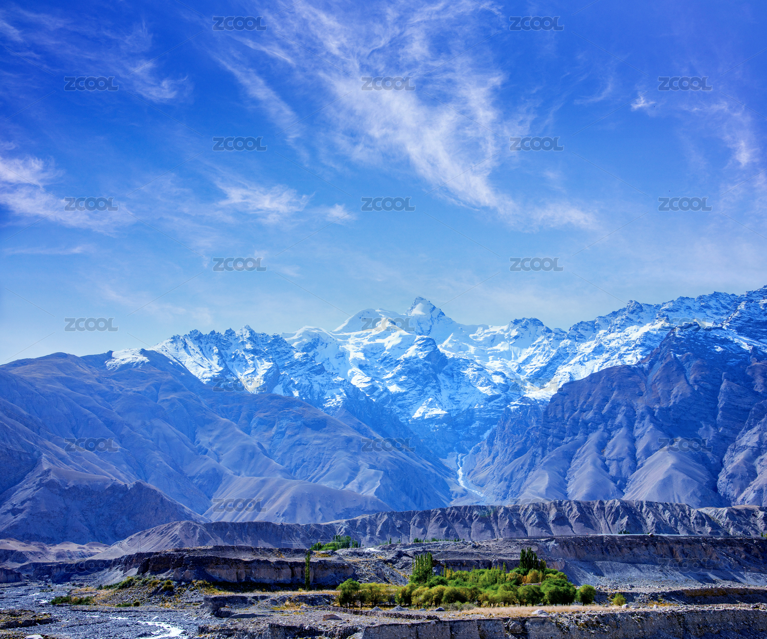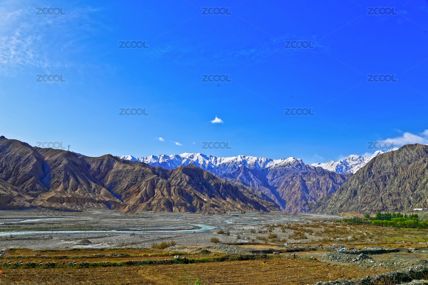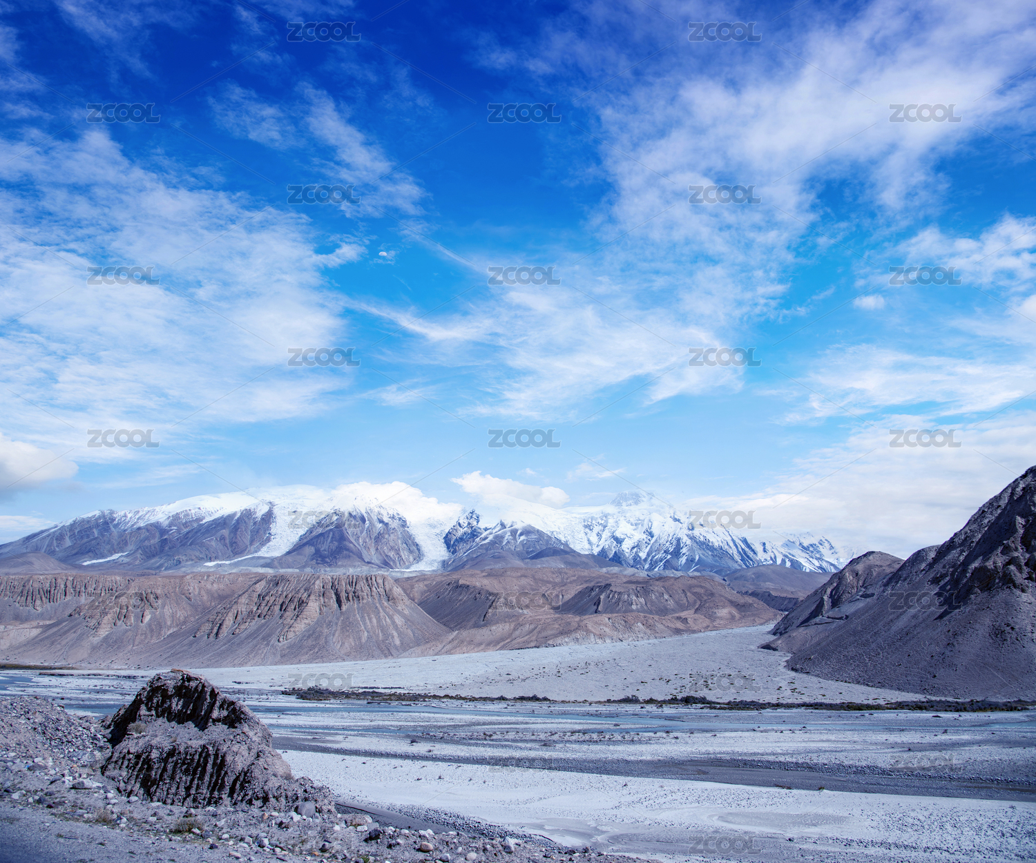 中国新疆帕尔米高原雪峰及喀拉喀什河