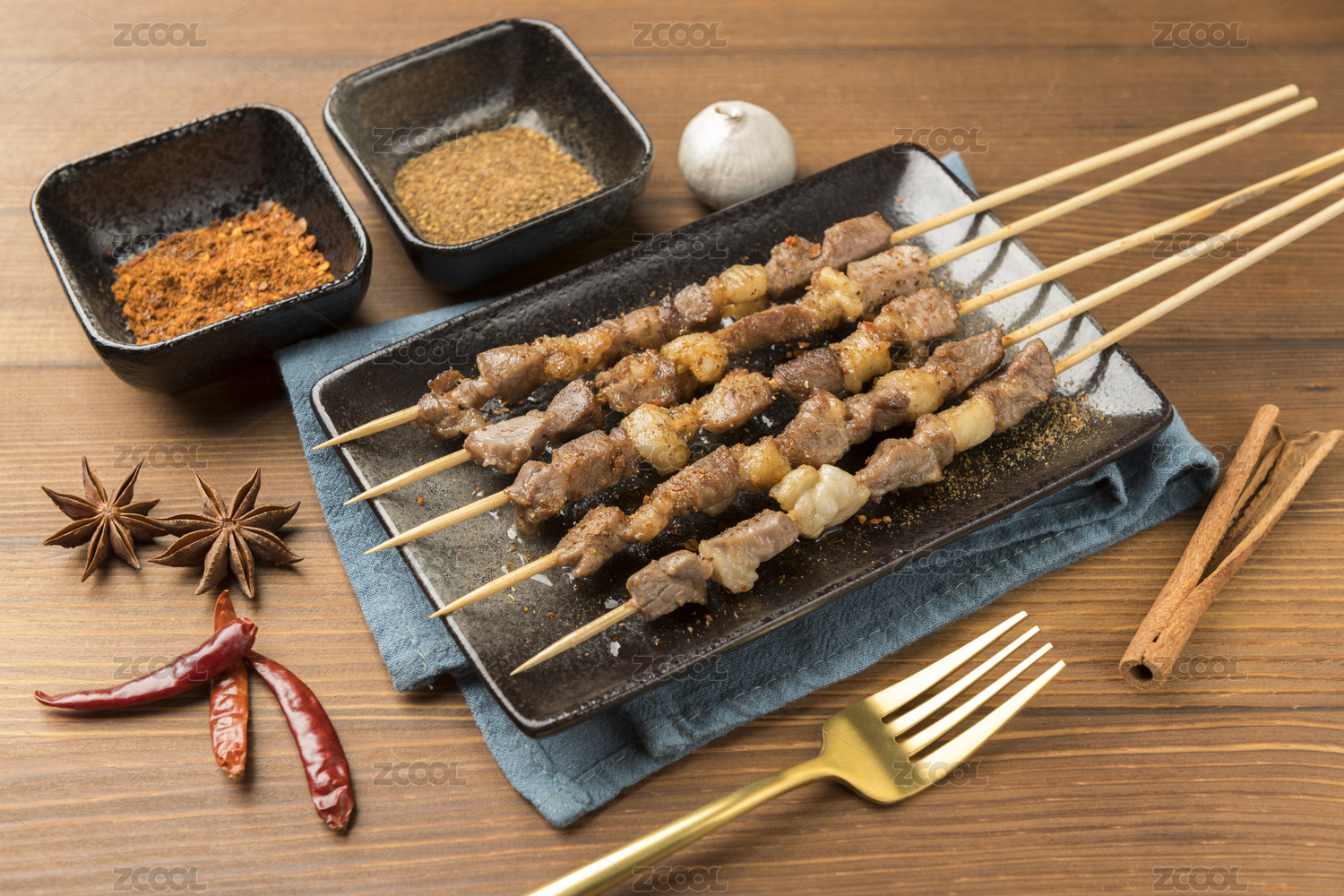 木质桌面,圆盘,烤肠,烤肠串,木签