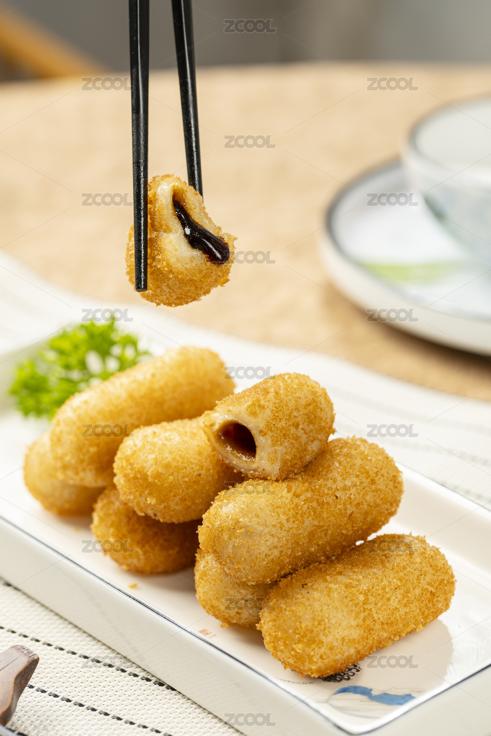 筷子夹着一根红糖糍粑在蘸圆盘子里的红糖水