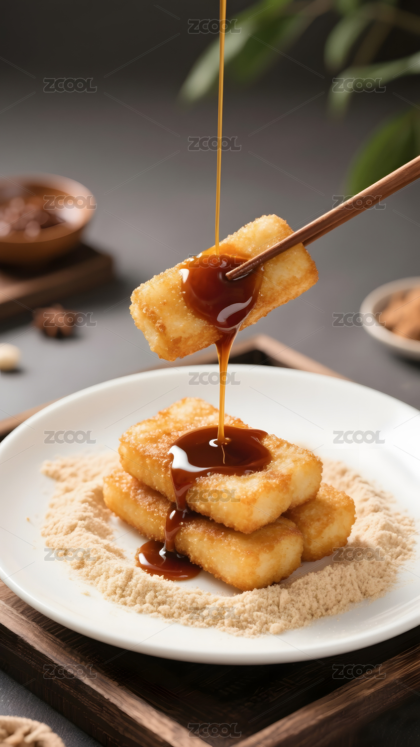 红糖糍粑,红糖,木盘子,木质桌面,餐布