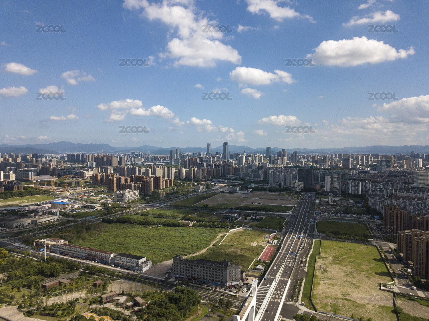 杭州滨江城市风光有着蓝天白云