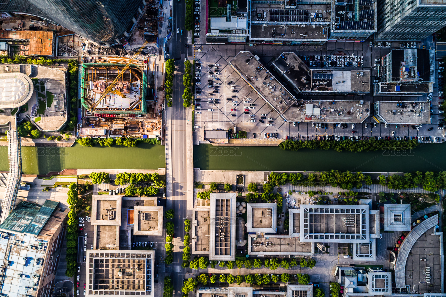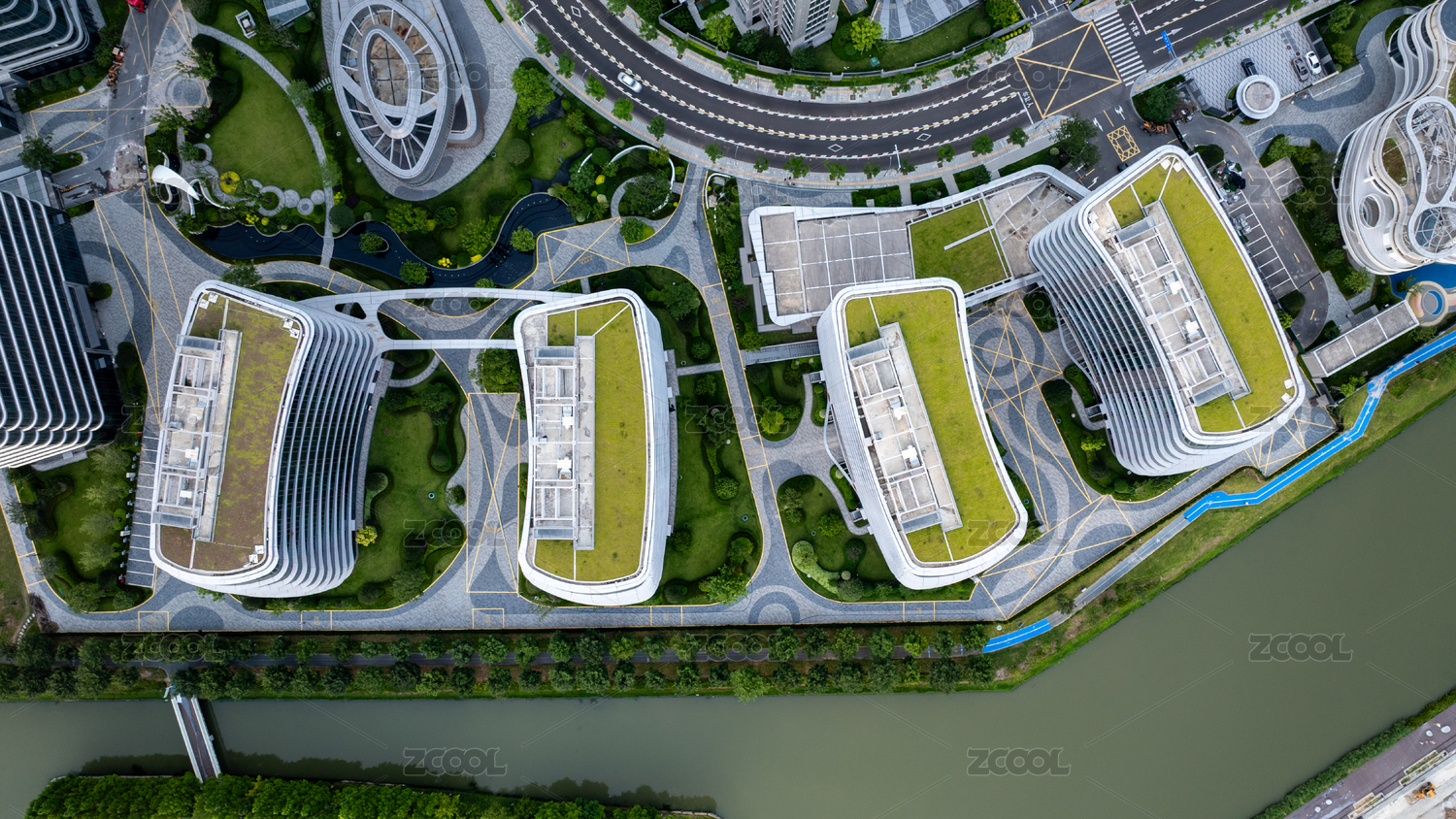 航拍绿色城市,屋顶和建筑周围都种满了绿植