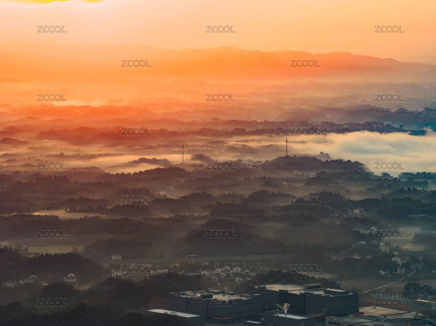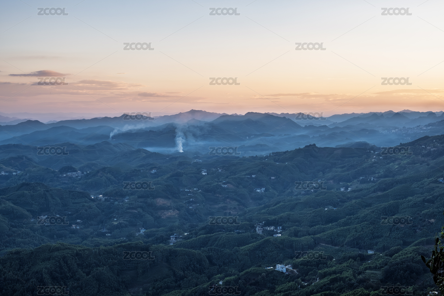 晨雾缭绕的村庄与山峦