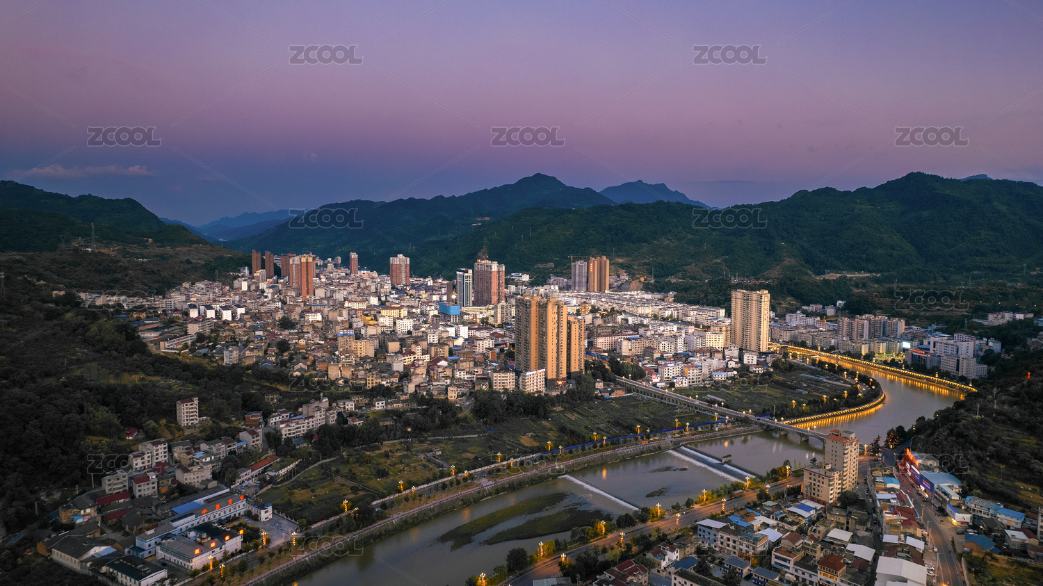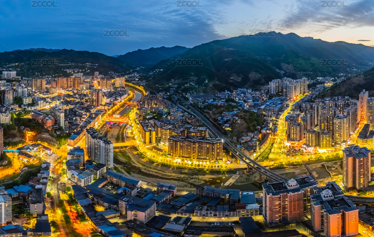 中国四川省万源市夜晚主城区高楼大厦建筑