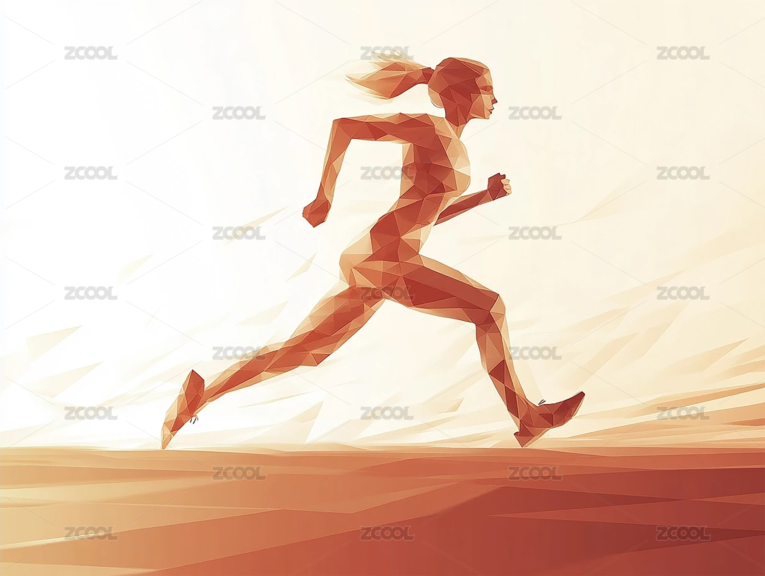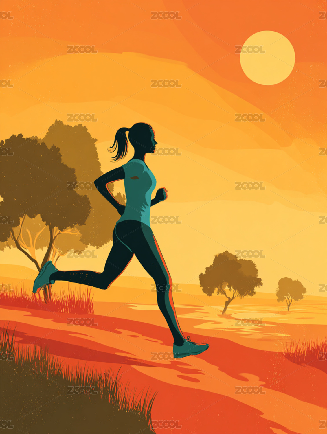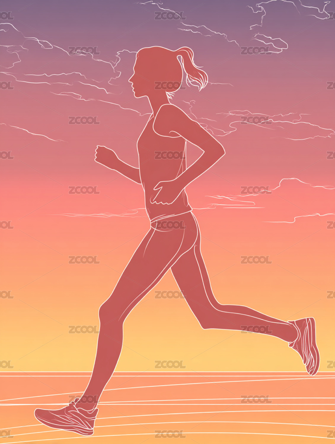 女性跑步,运动鞋,清晨阳光,健康活力,运动剪影,留白背景,二维插画