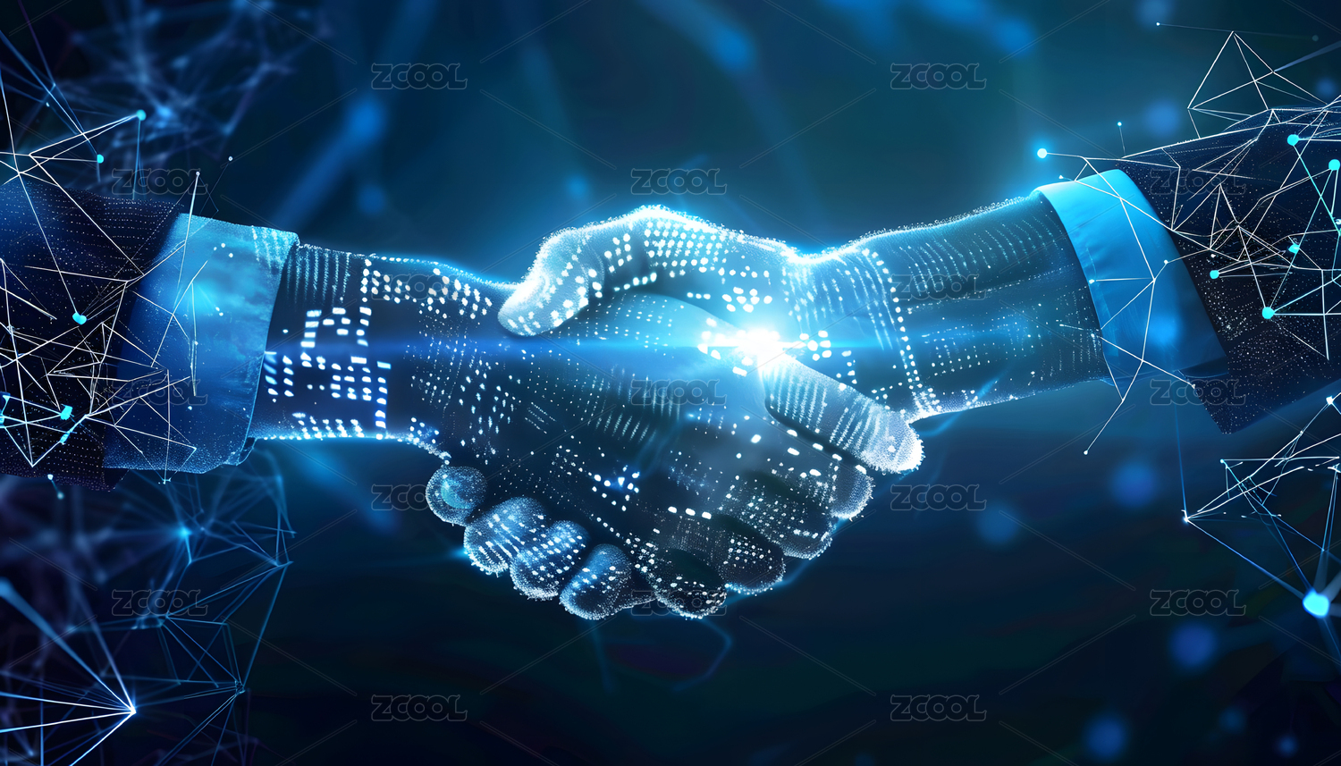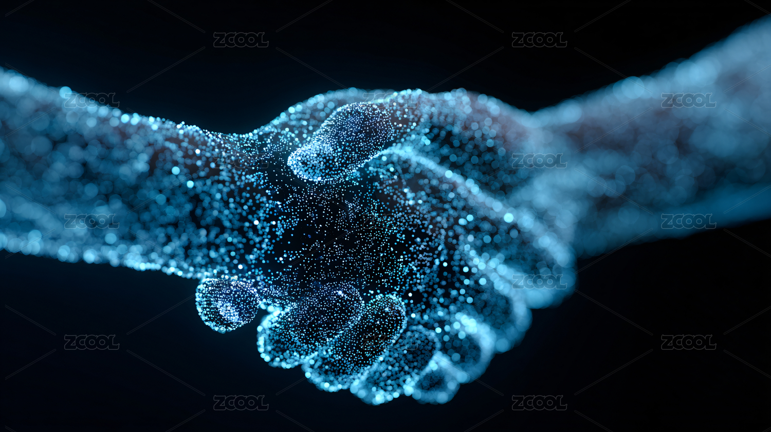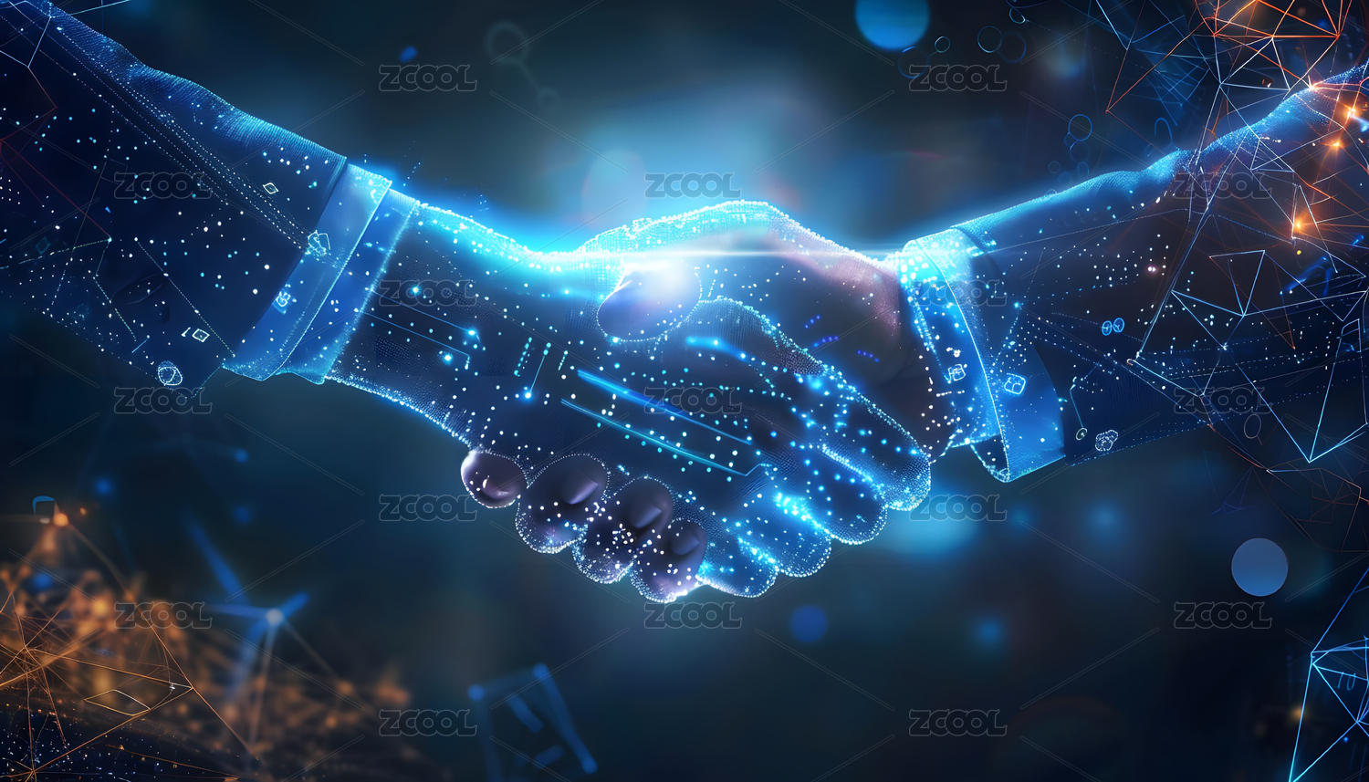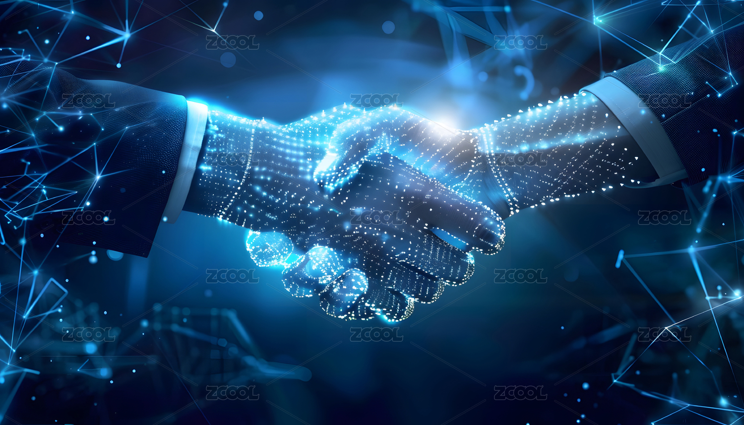数智,交融,蓝黄,粒子,握手,契约,视觉,美学,科技,合作