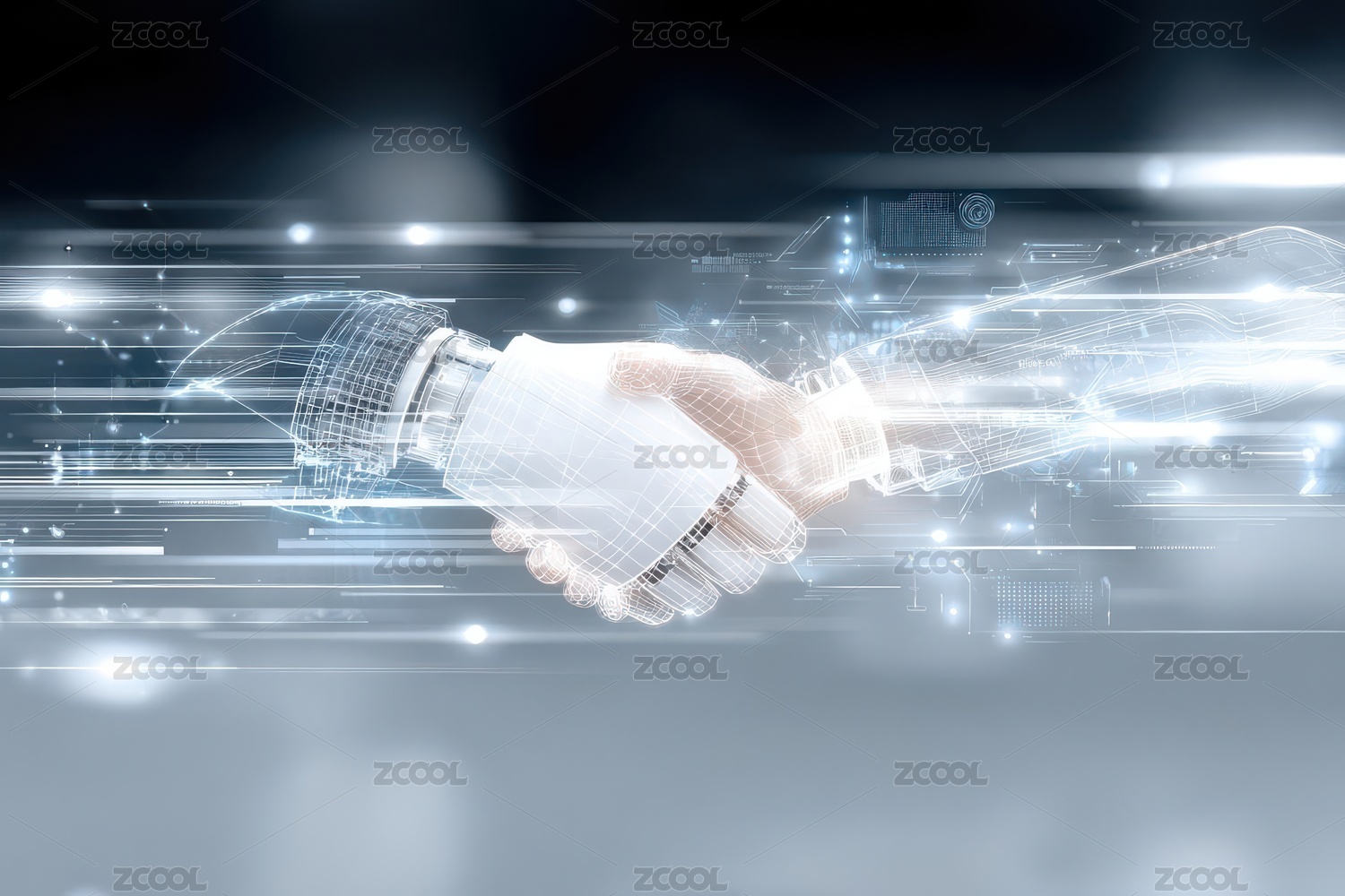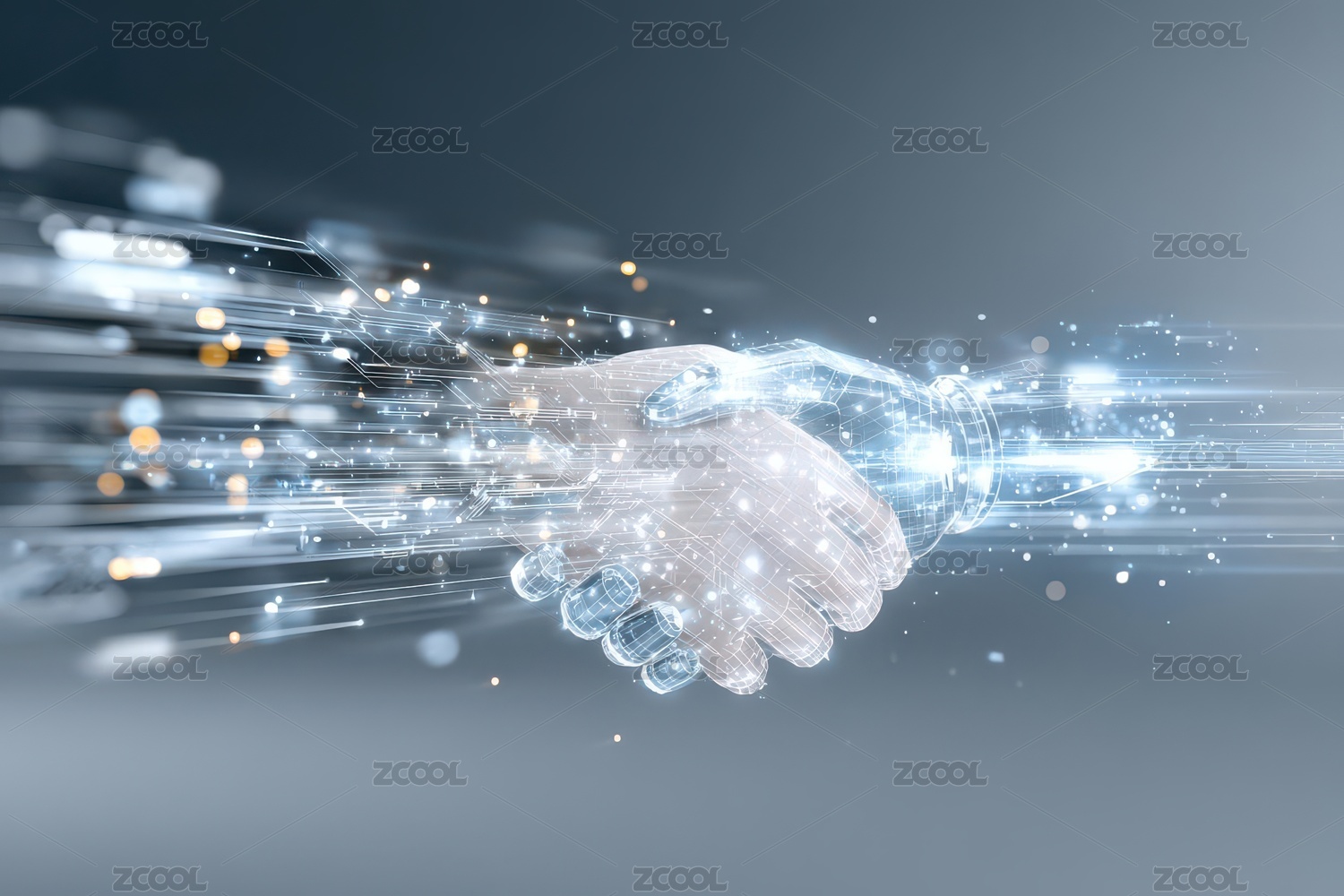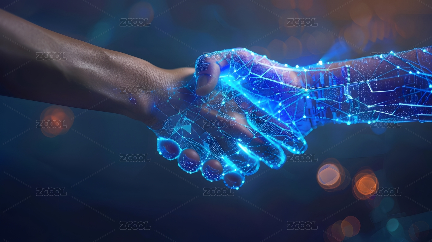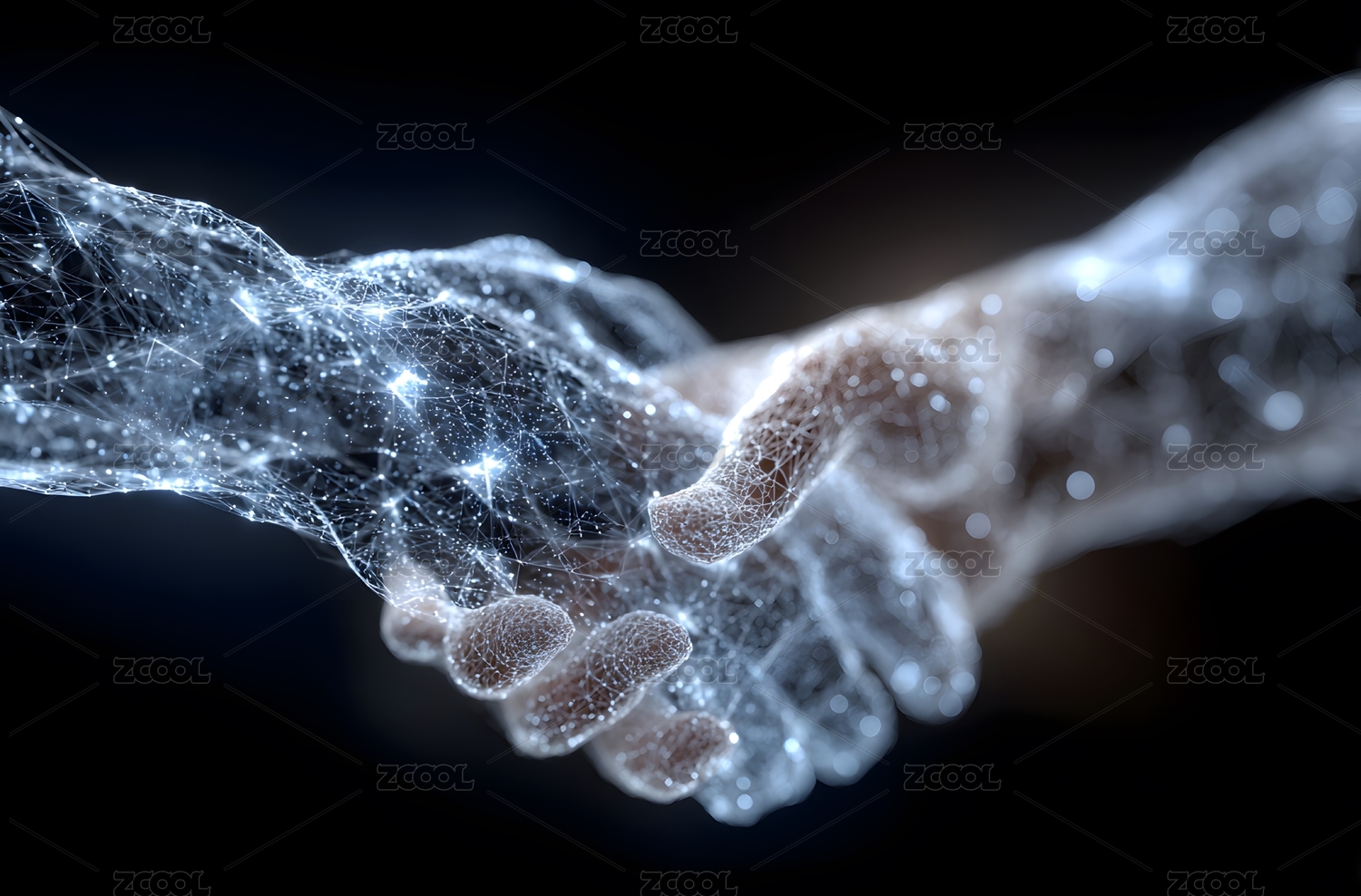 数智,交融,蓝黄,粒子,握手,契约,视觉,美学,科技,合作