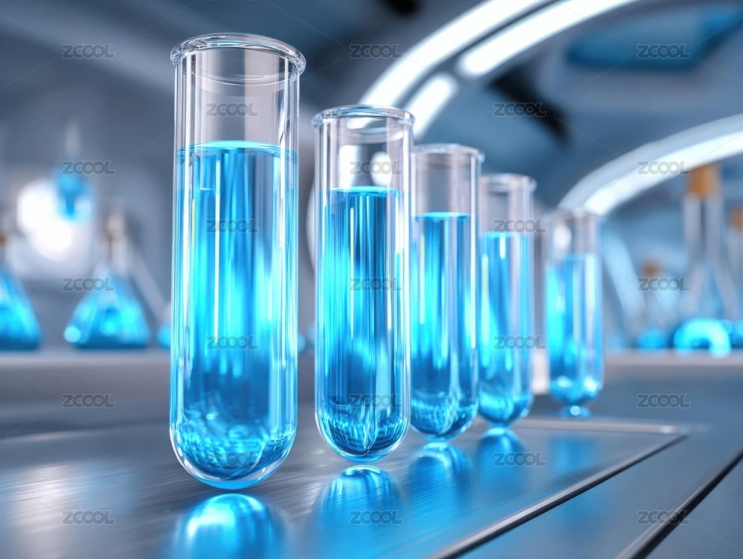 未来实验室中的蓝色试剂管