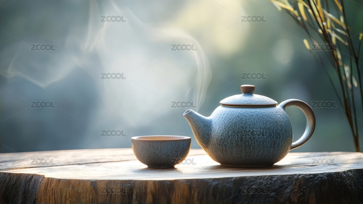 茶壶,茶杯,蒸汽,茶水,木质,桌面,晨光,户外,宁静,清新