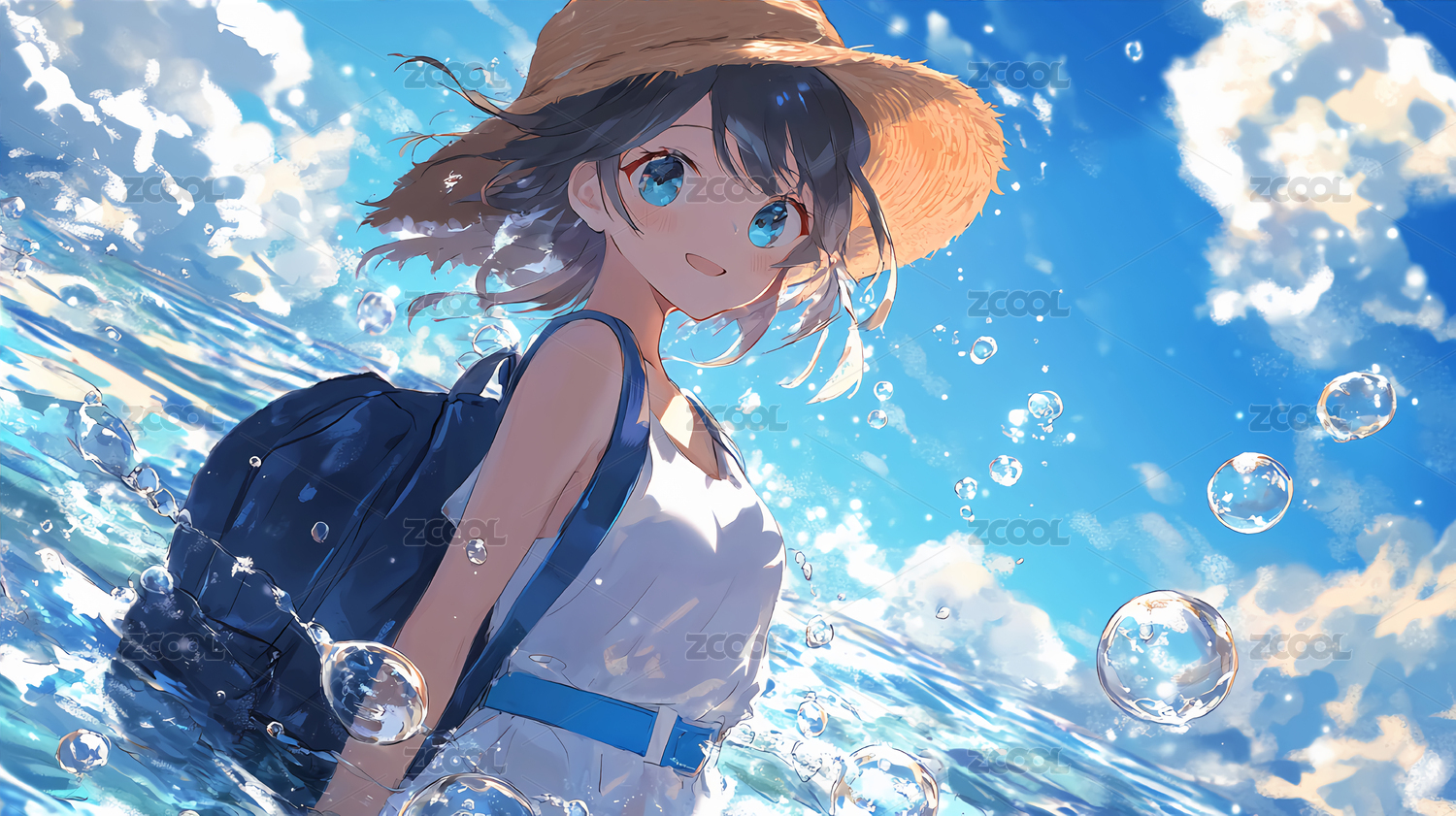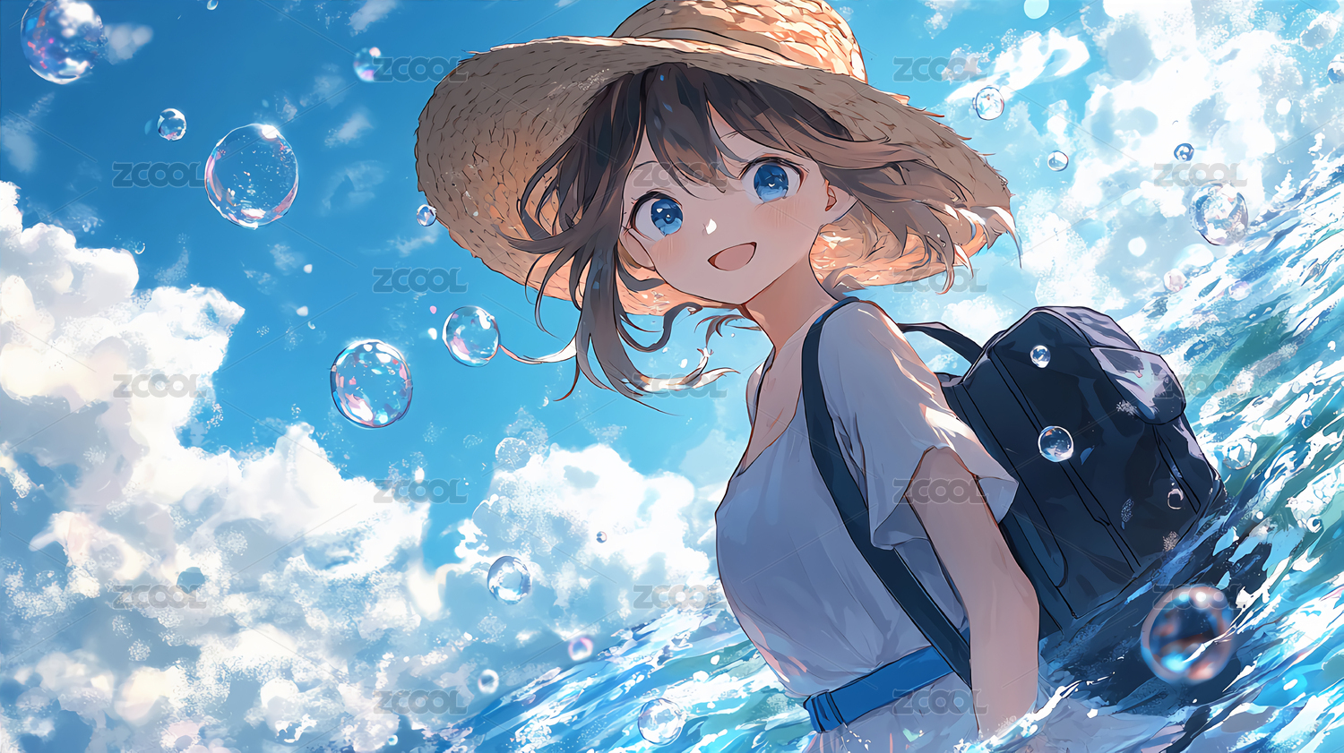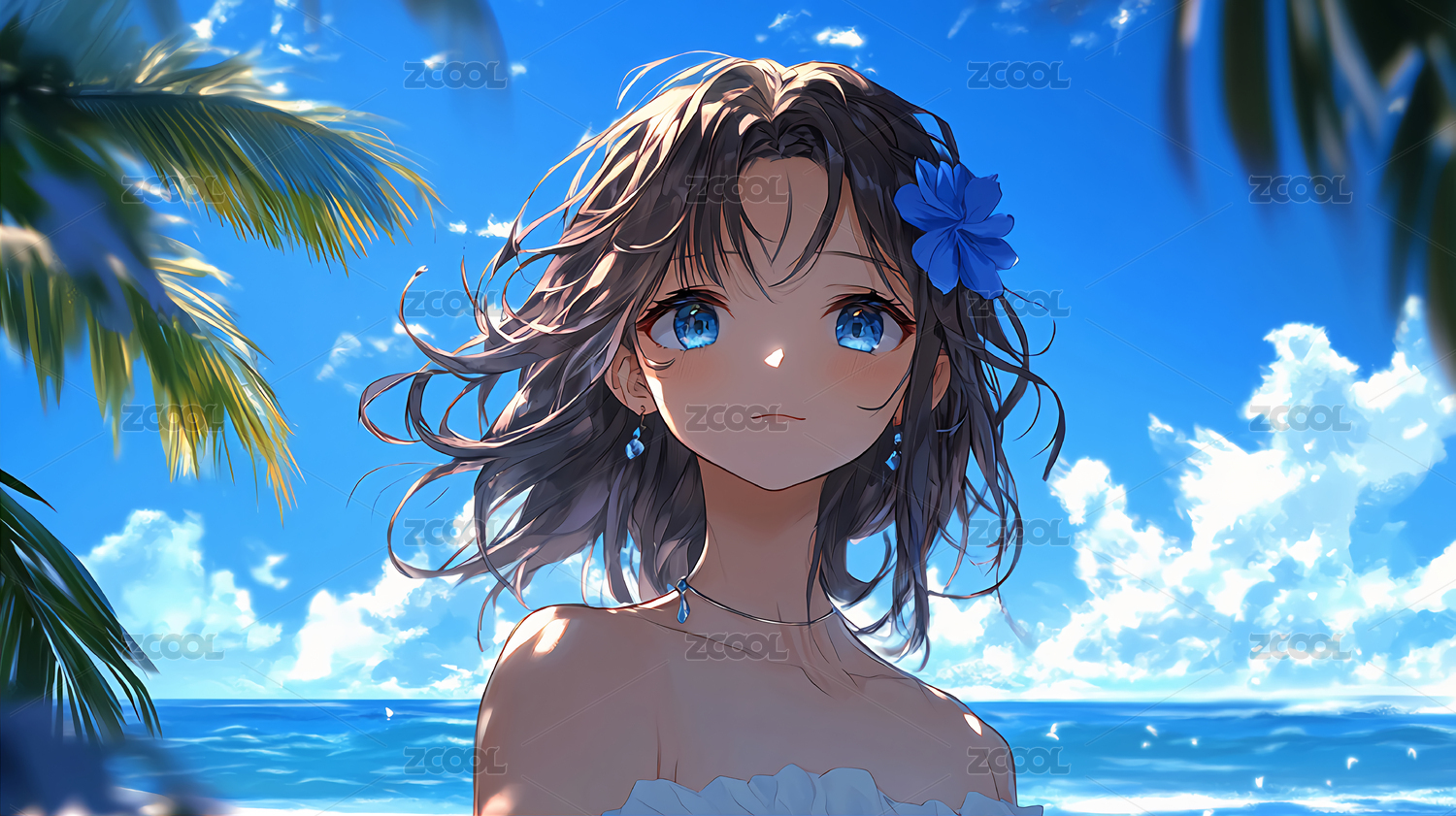 动漫,女孩,海滩,夏日,椰子,饮料,沙滩,风情,二次元,治愈