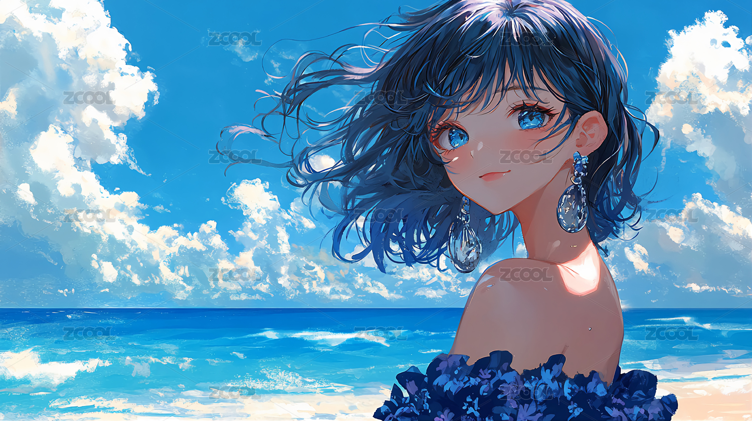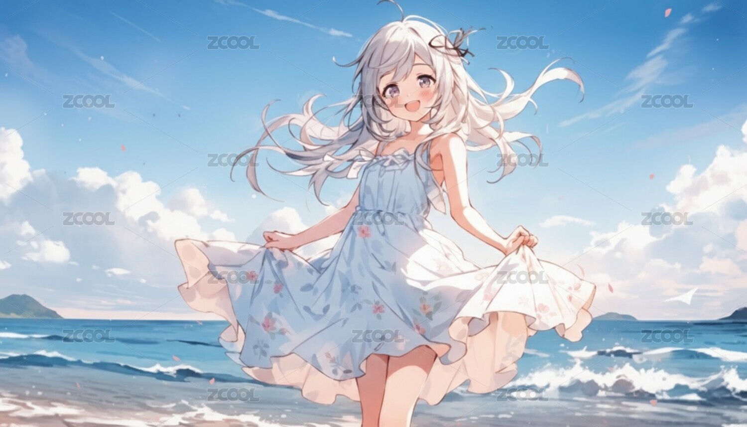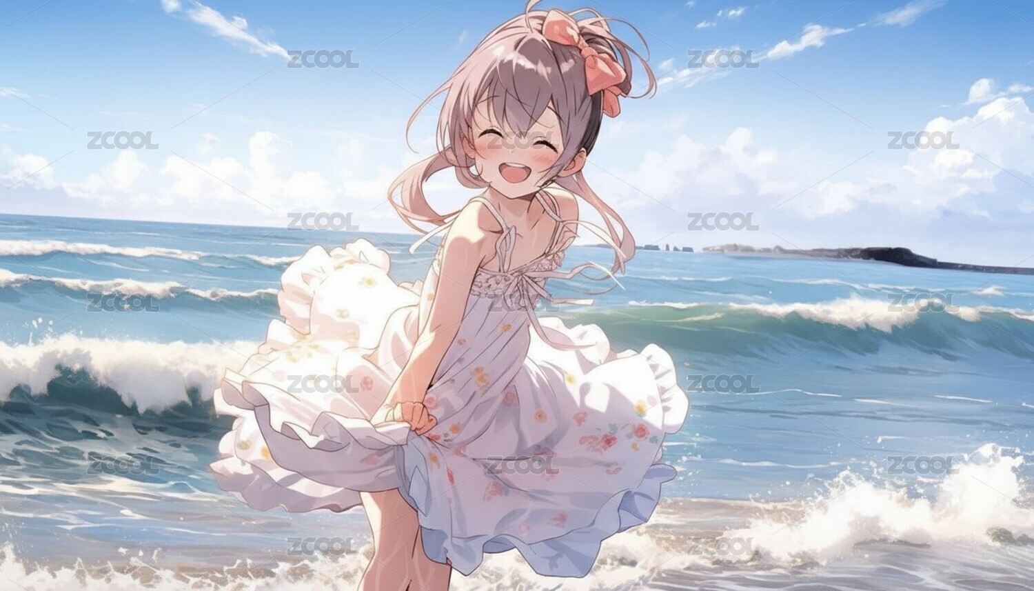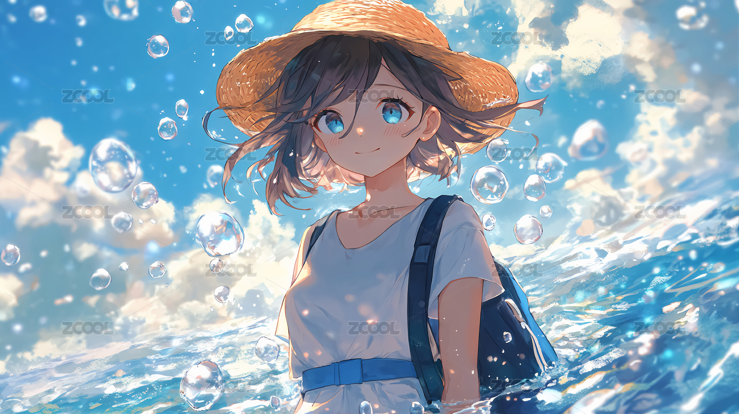 动漫,女孩,海滩,夏日,椰子,饮料,沙滩,风情,二次元,治愈