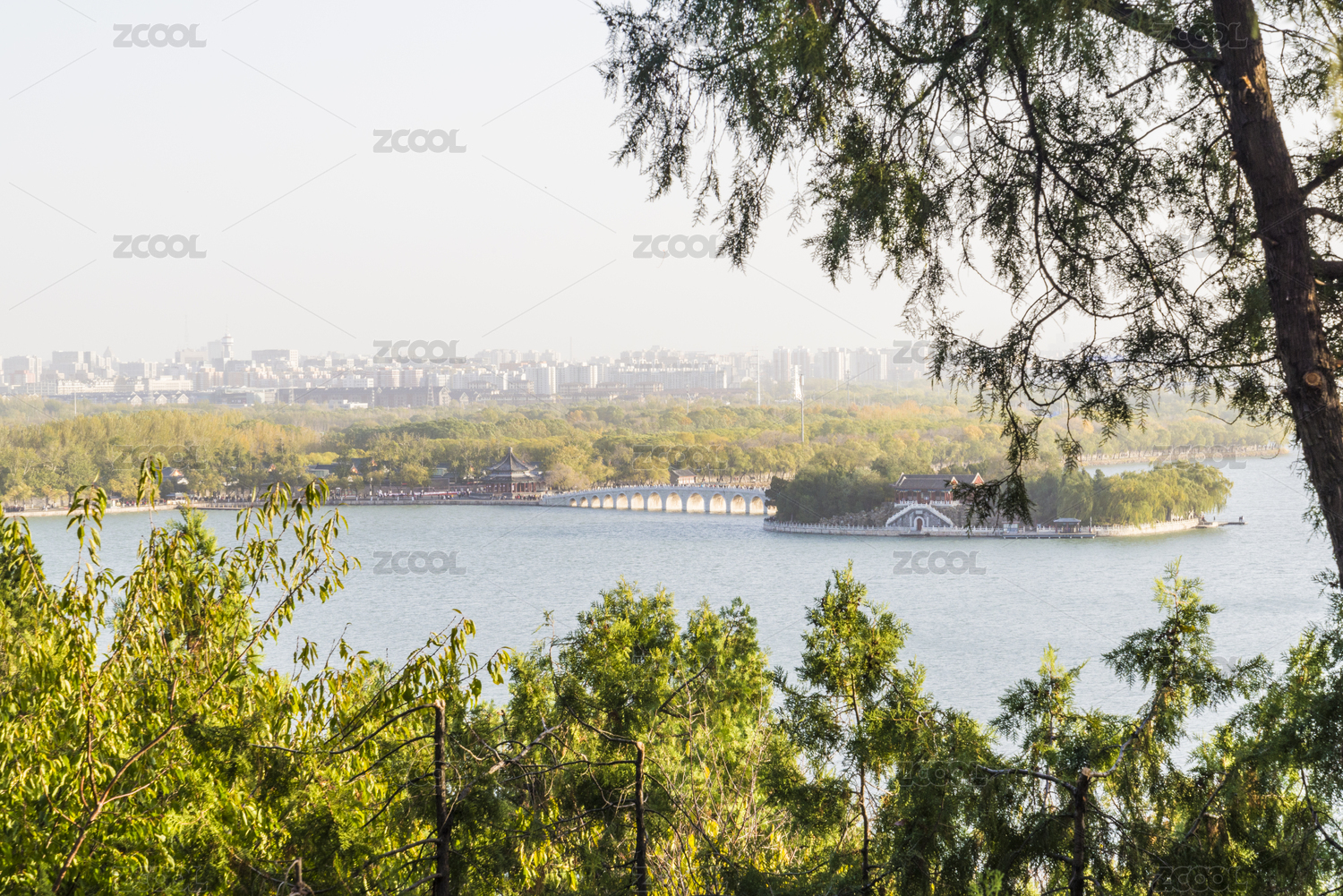 秋天的北京颐和园公园的树林远眺昆明湖的十七孔桥