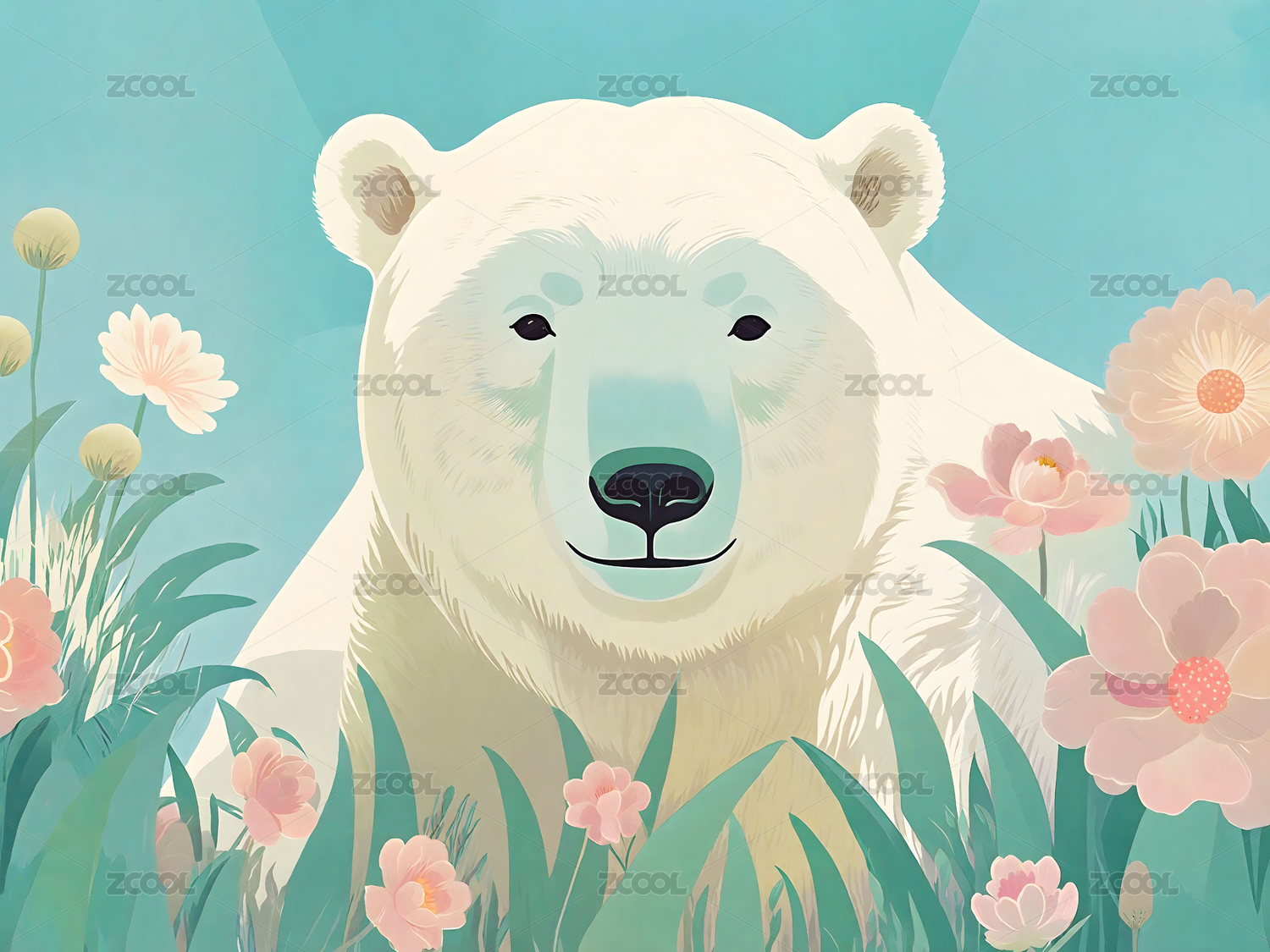 北极熊怀抱花丛的温馨场景