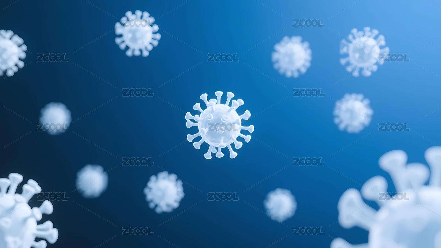 漂浮白色病毒粒子蓝色渐变背景