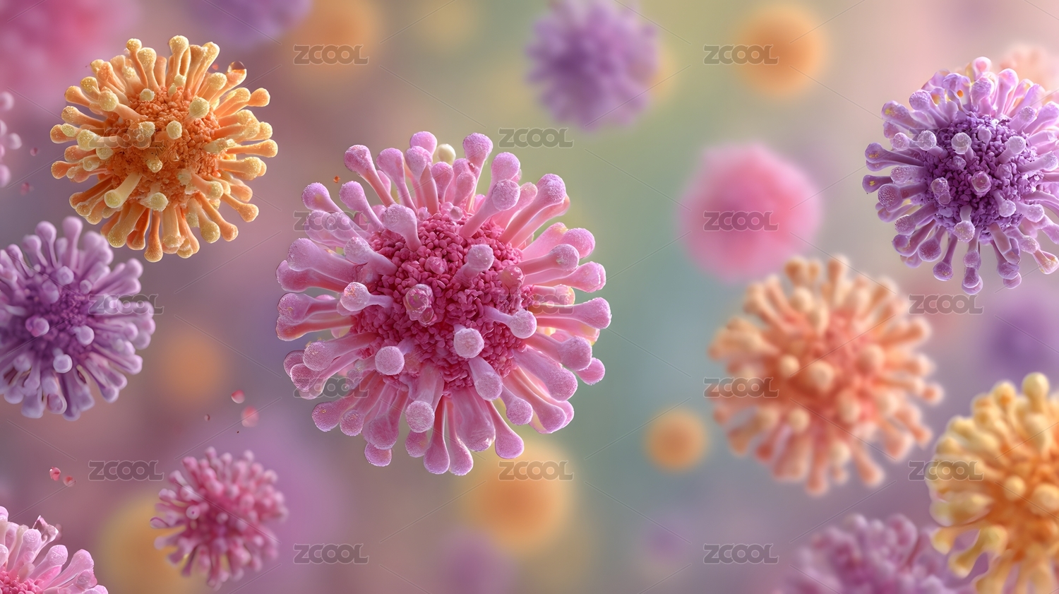 彩色病毒细菌飘浮 柔和抽象背景