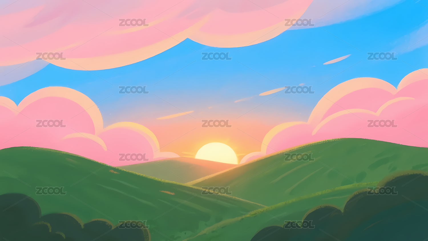 背景,蓝天,黄色,绿色,粉色,山丘,太阳,云朵,温暖,童趣