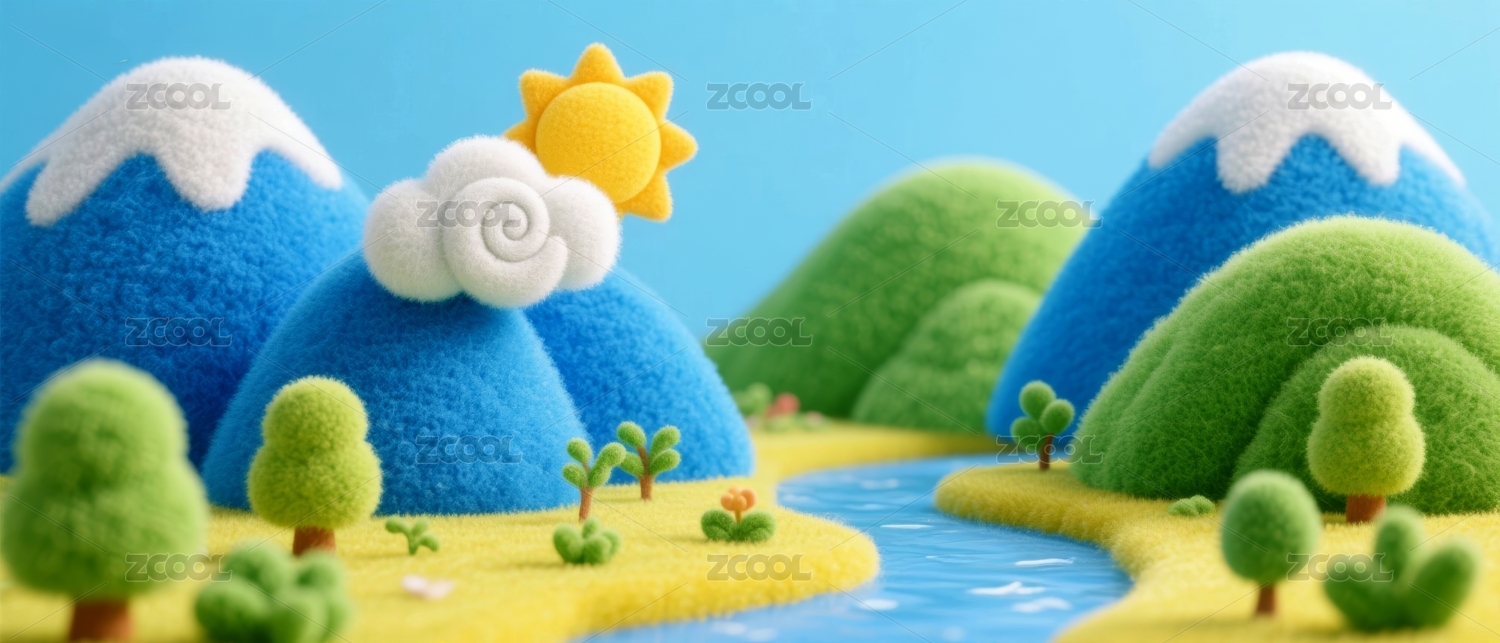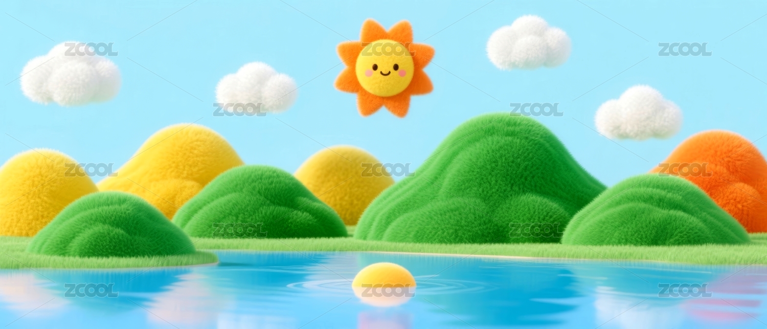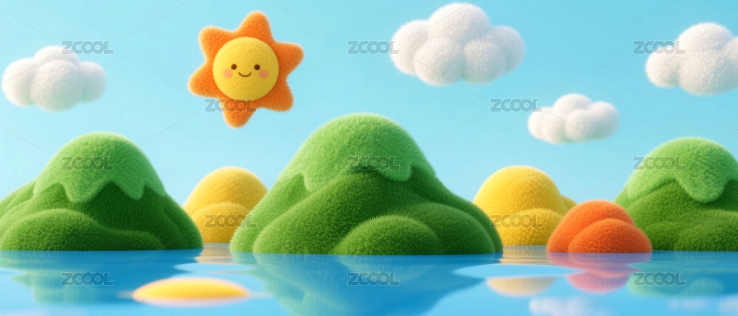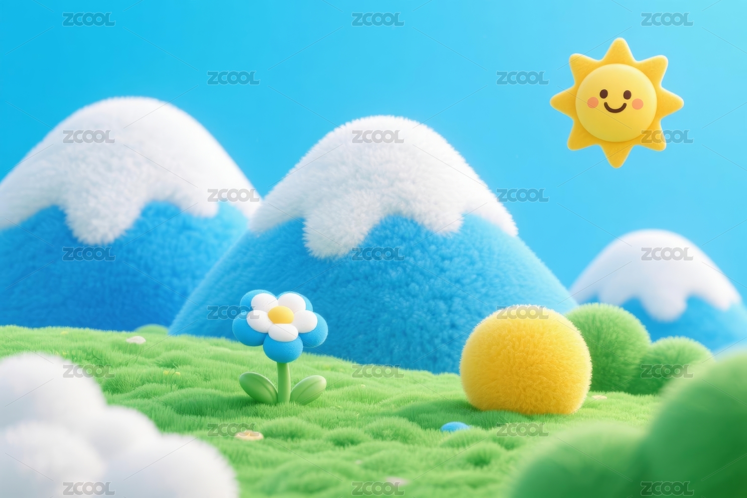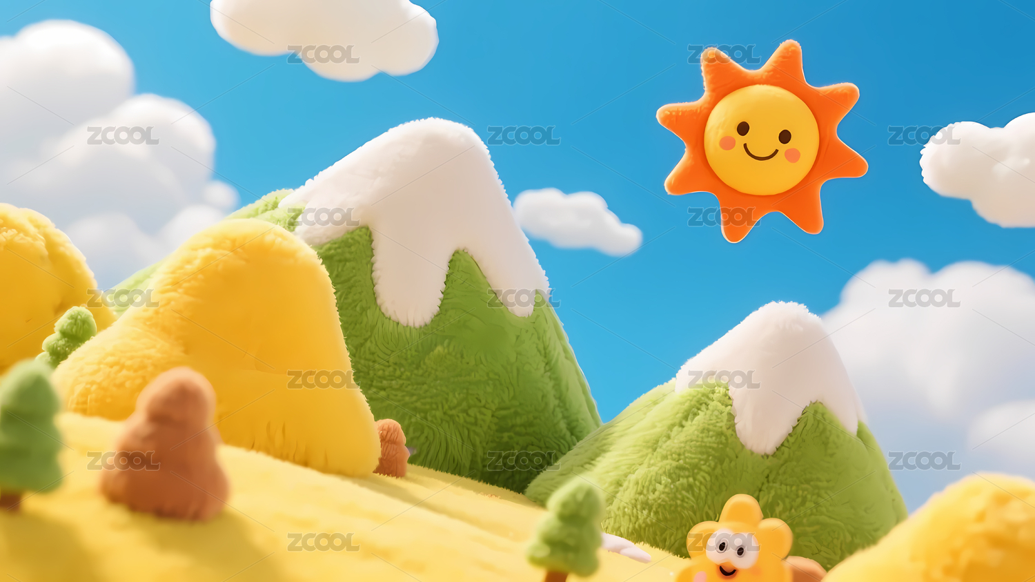 背景,绿色,黄色,橙色,蓝天,白云,雪山,太阳,笑脸,小鸡
