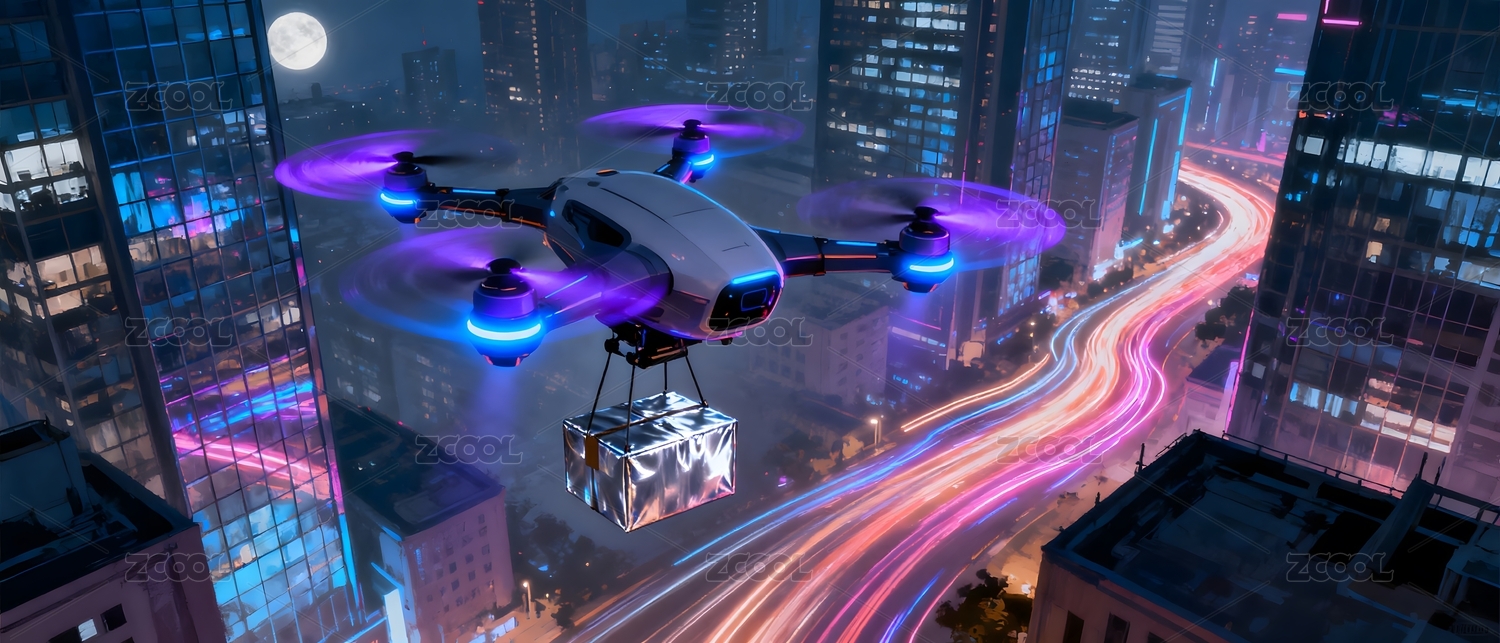 夜景城市无人机运输包裹