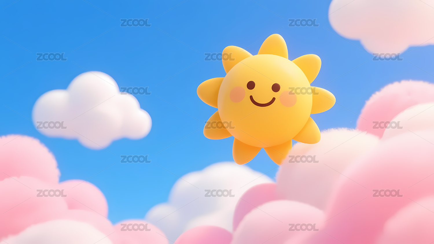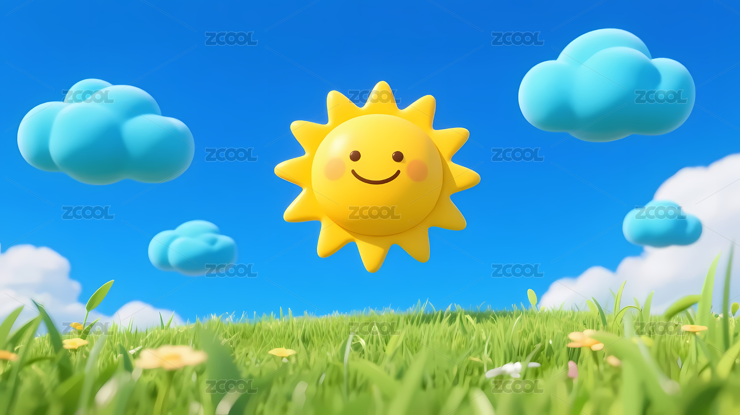 绿色,黄色,山丘,蓝天,白云,明亮,卡通,太阳,笑脸,欢快