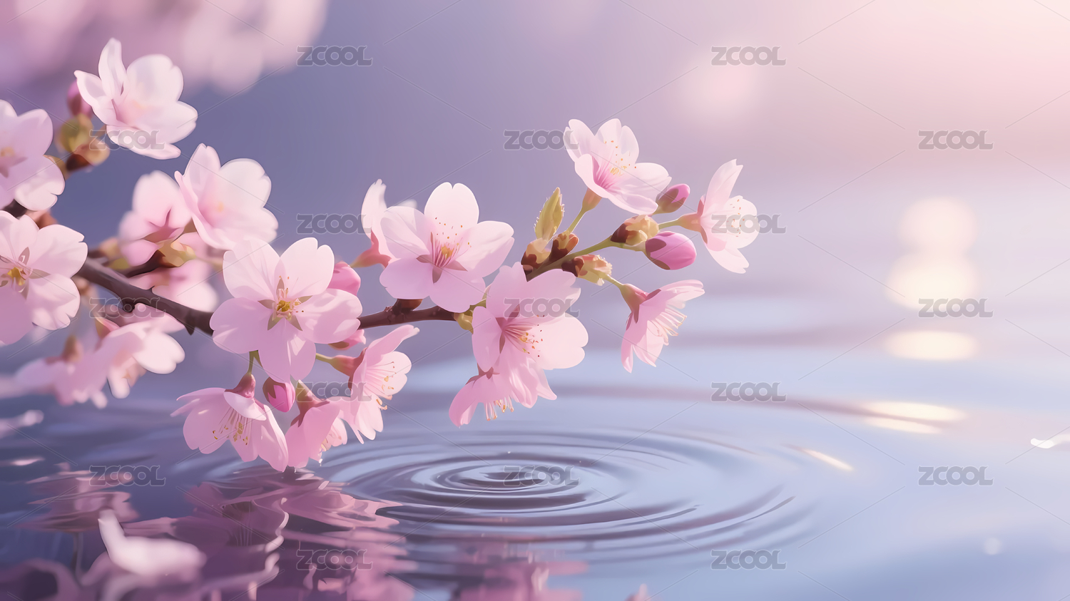 粉色樱花水面涟漪光线