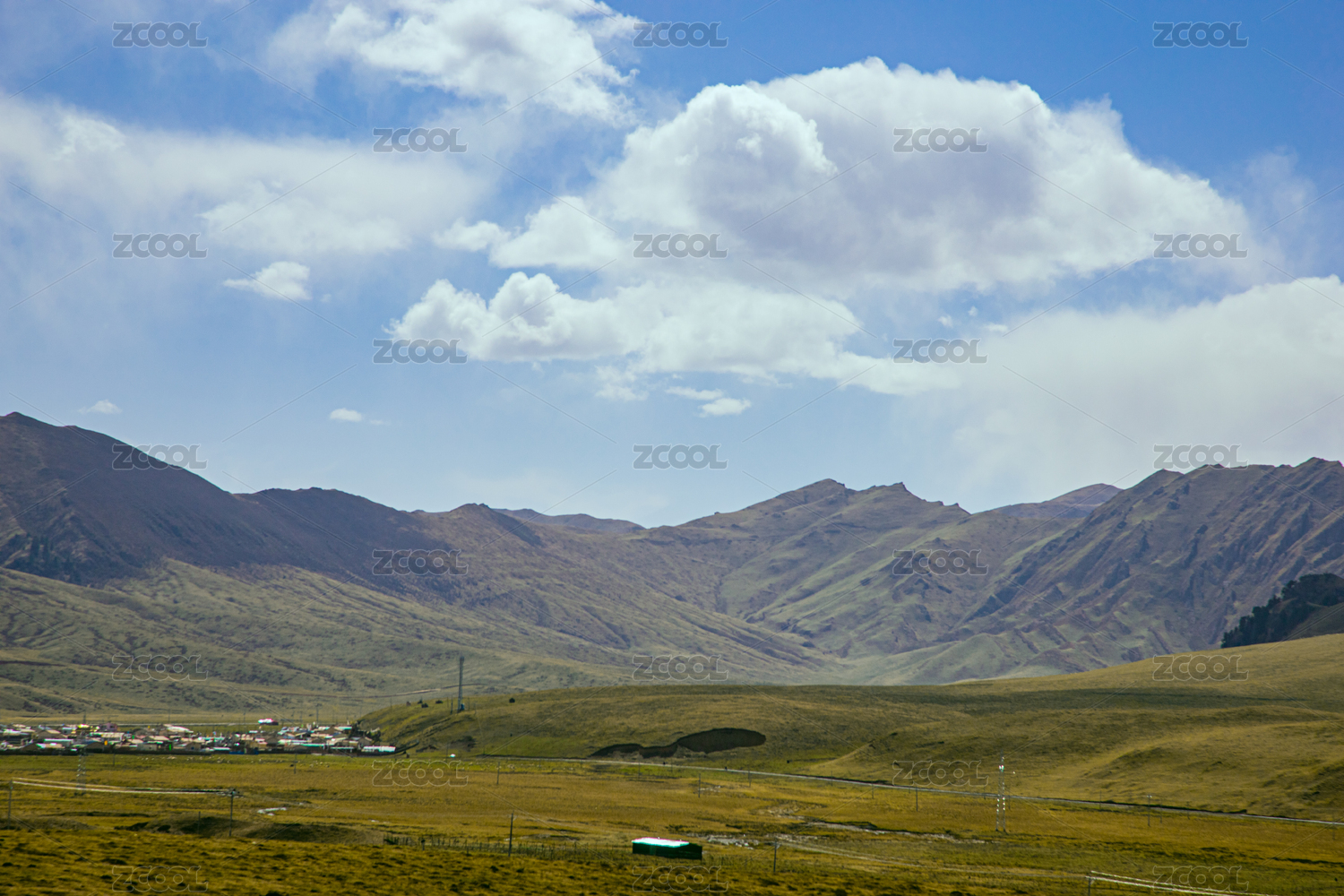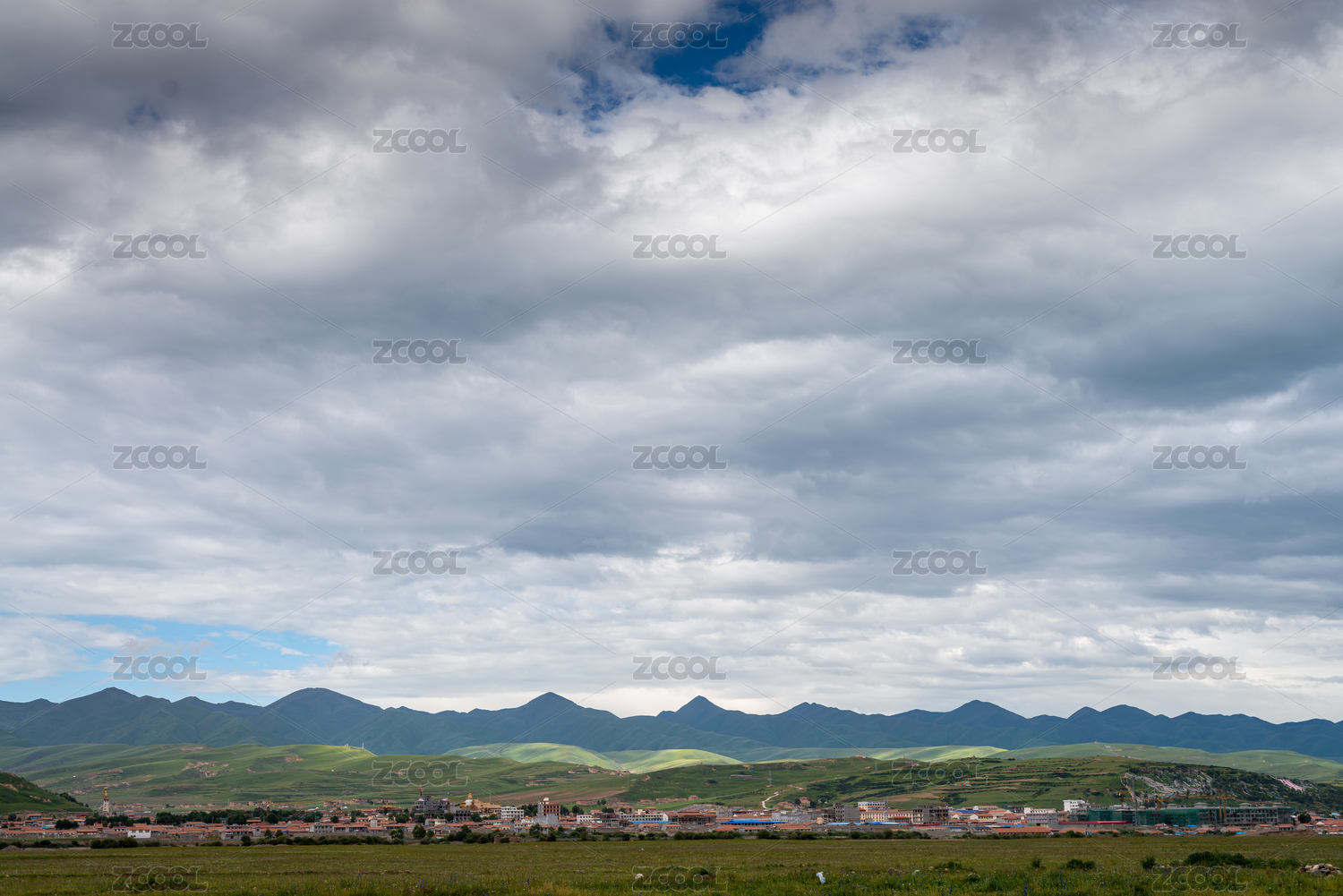 草原,城镇,远山,山脉,蓝天,白云,风光,景色,自然,建筑