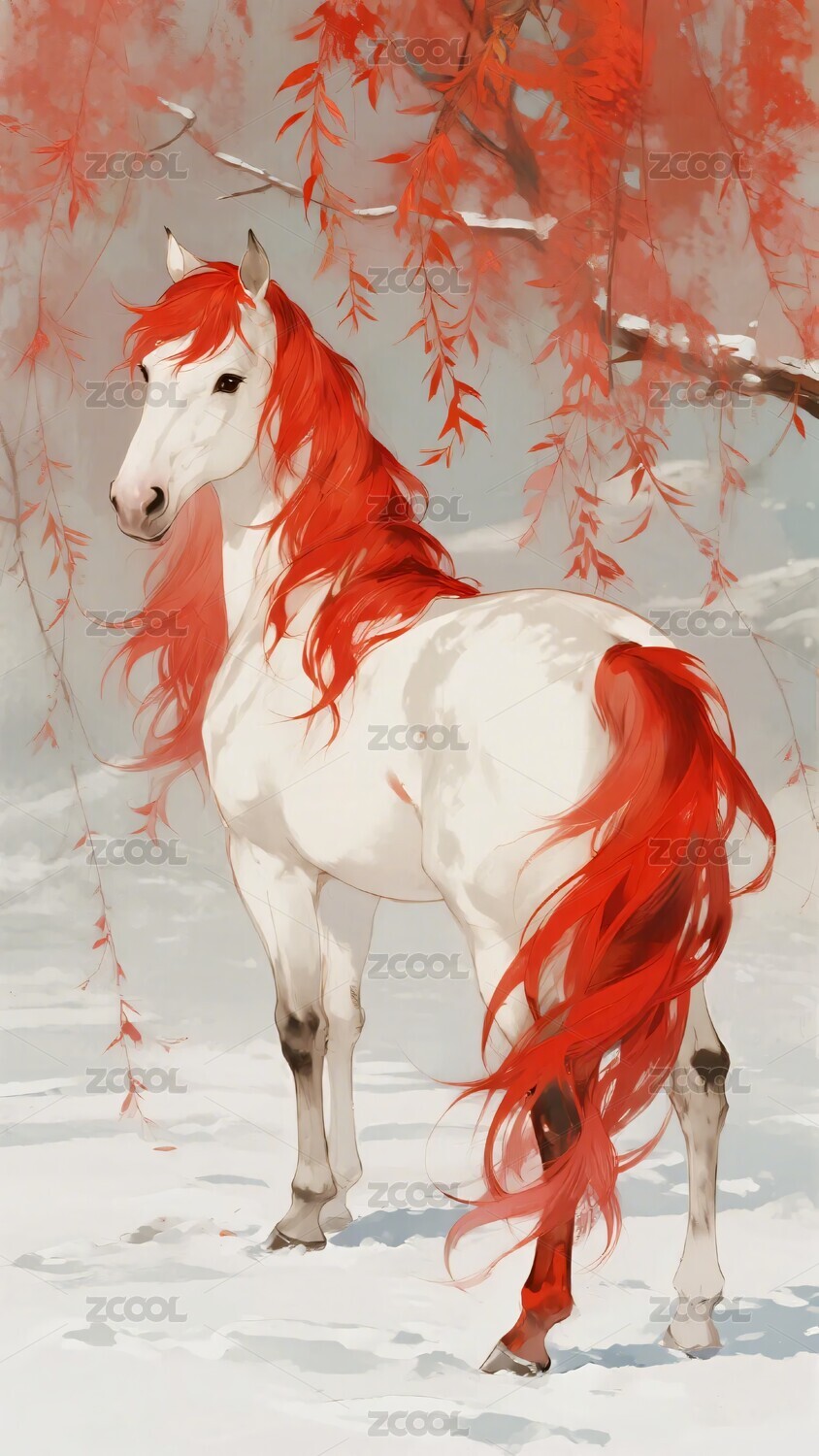 雪地中红鬃白马插画