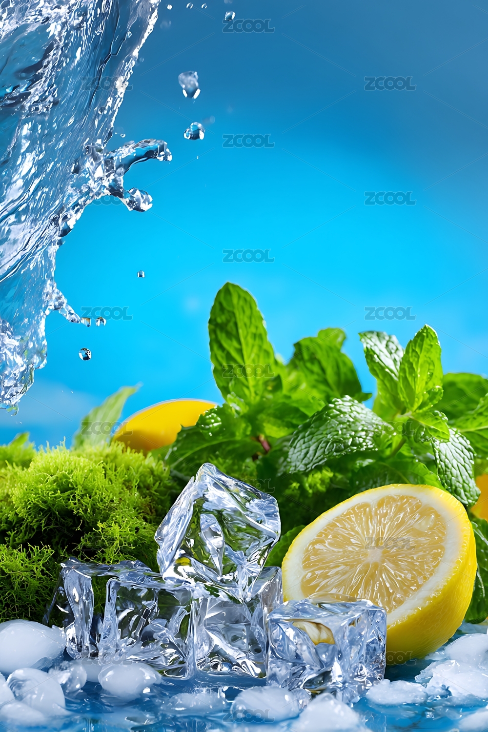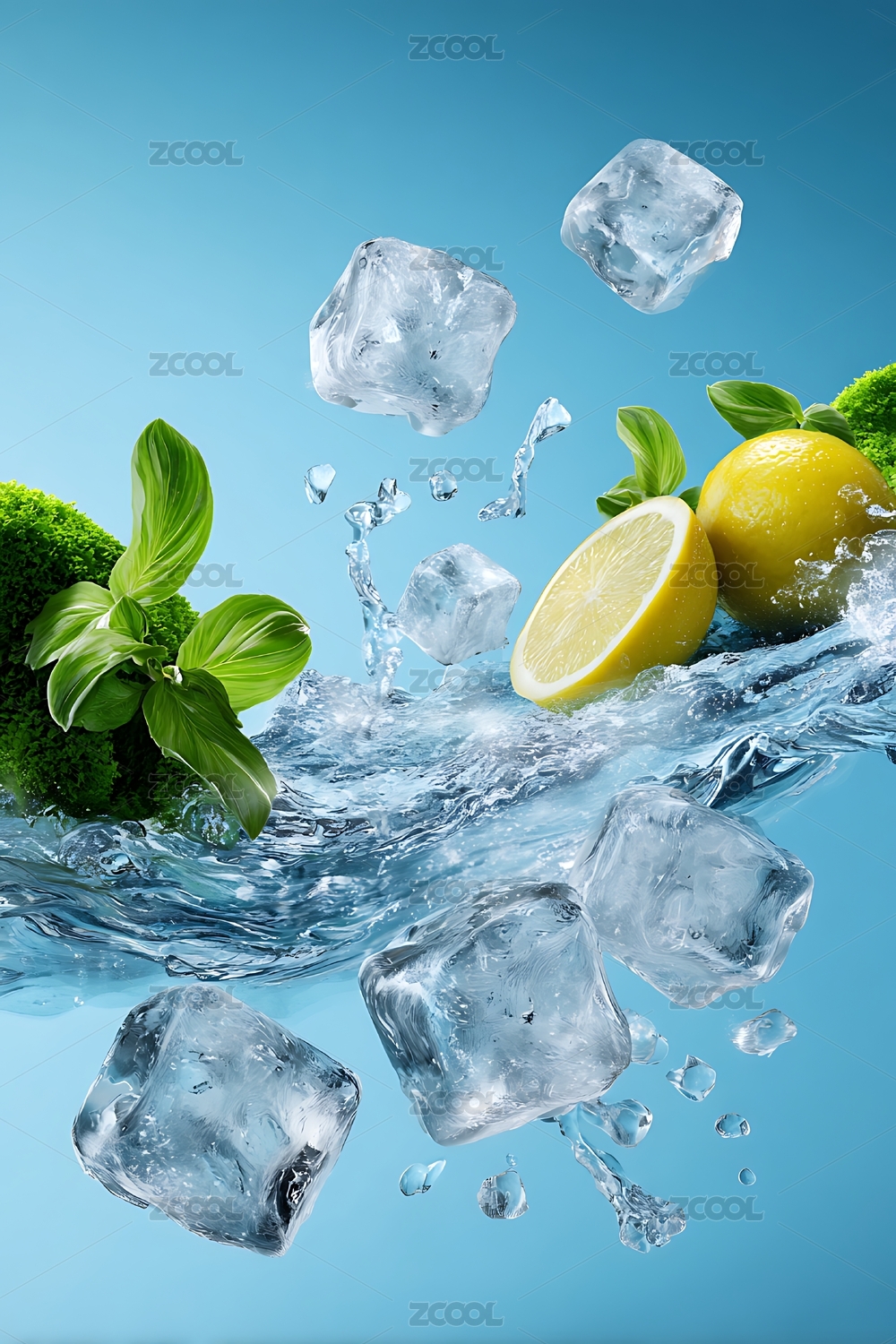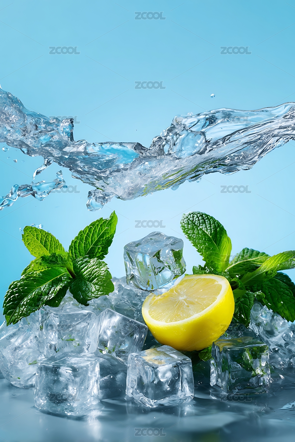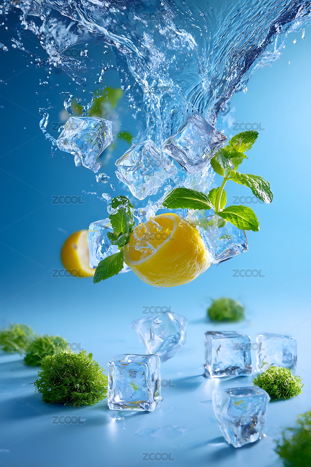 柠檬,冰块,水花,清凉,饮品,清新,绿色,飞溅,夏日,解渴