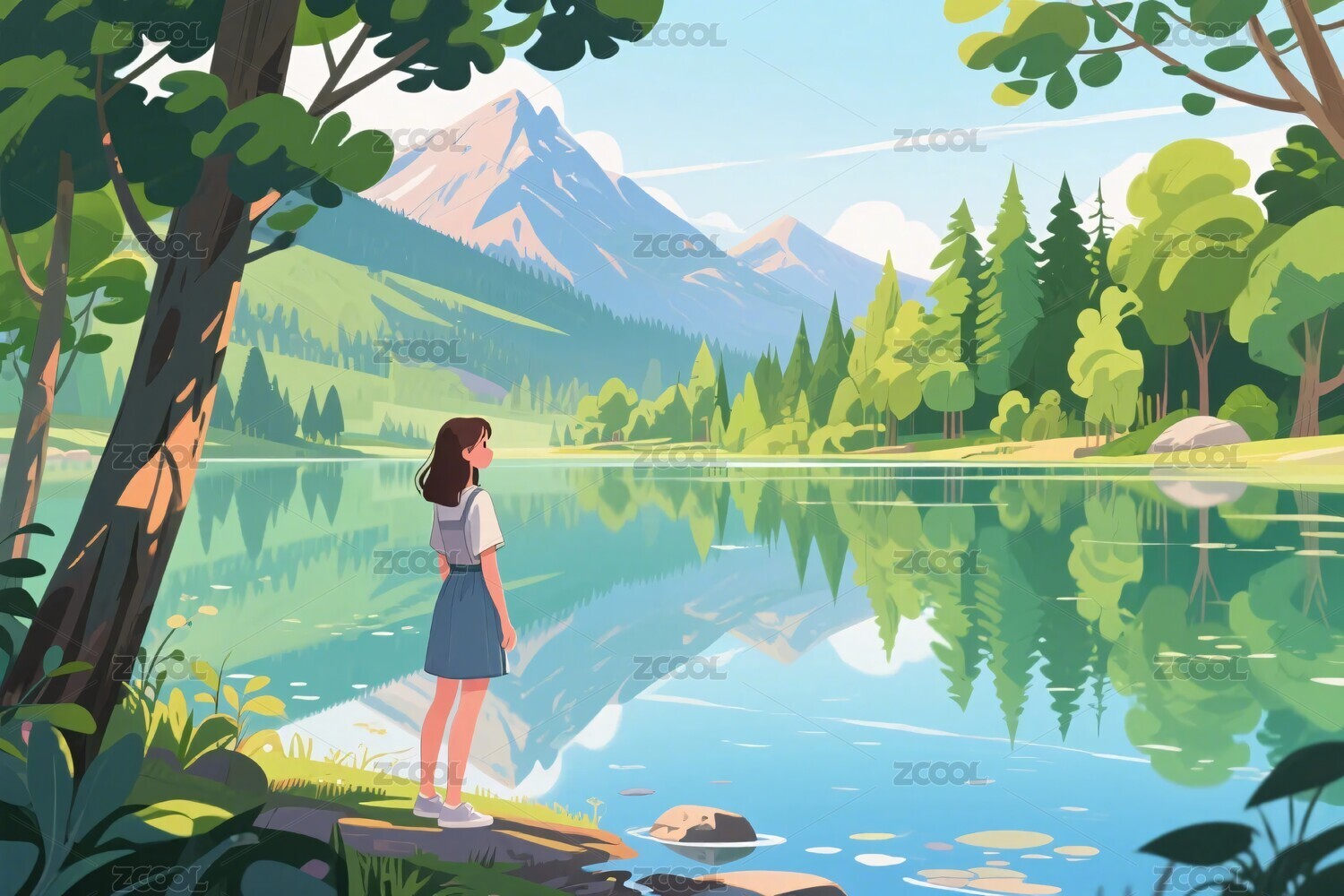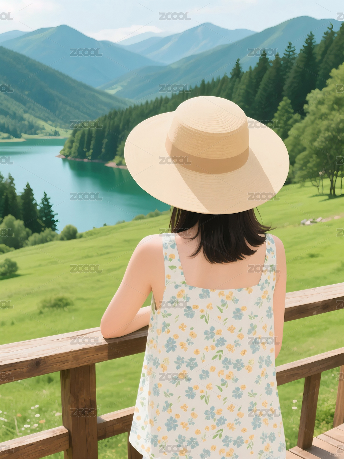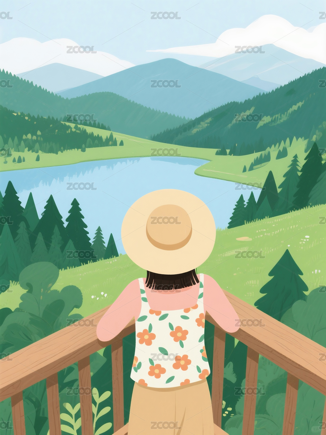 极简主义,扁平插画,背影视角,女性,遮阳帽,无袖上衣,白色,木质观景台,山间,风景