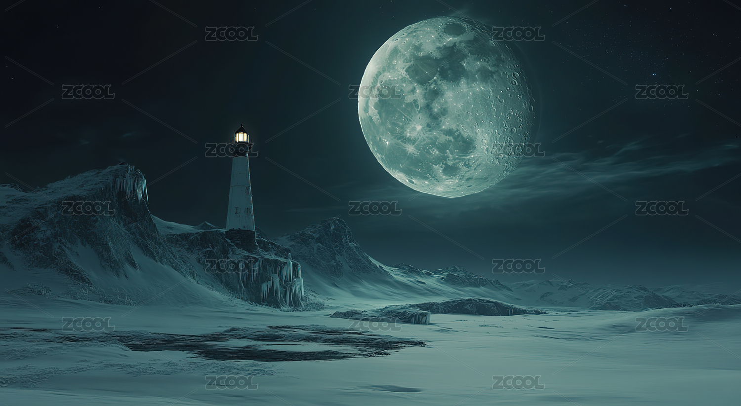 月夜下的海边灯塔景象