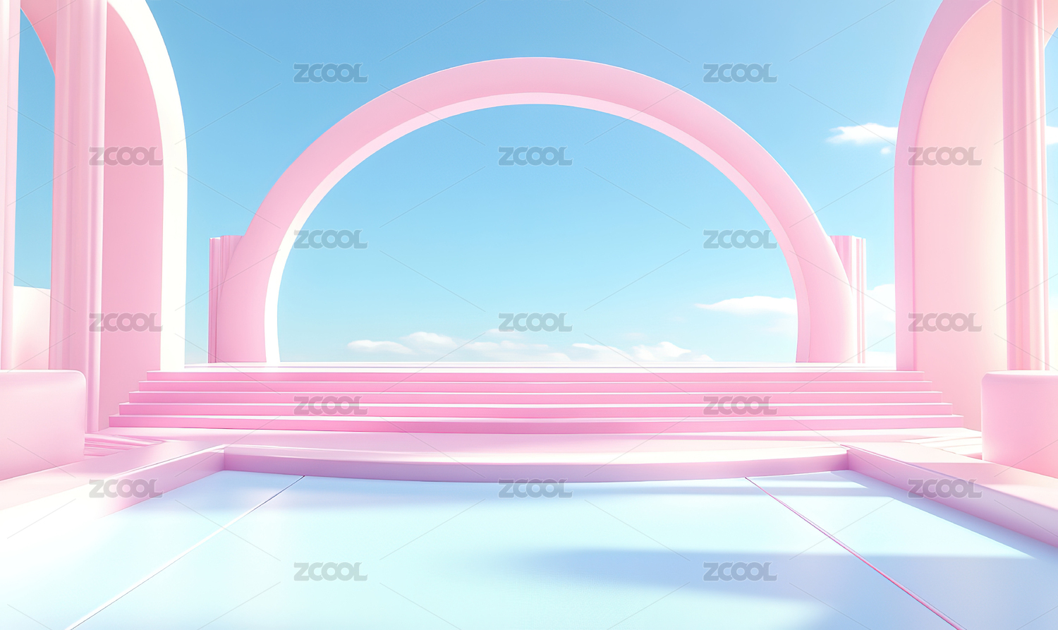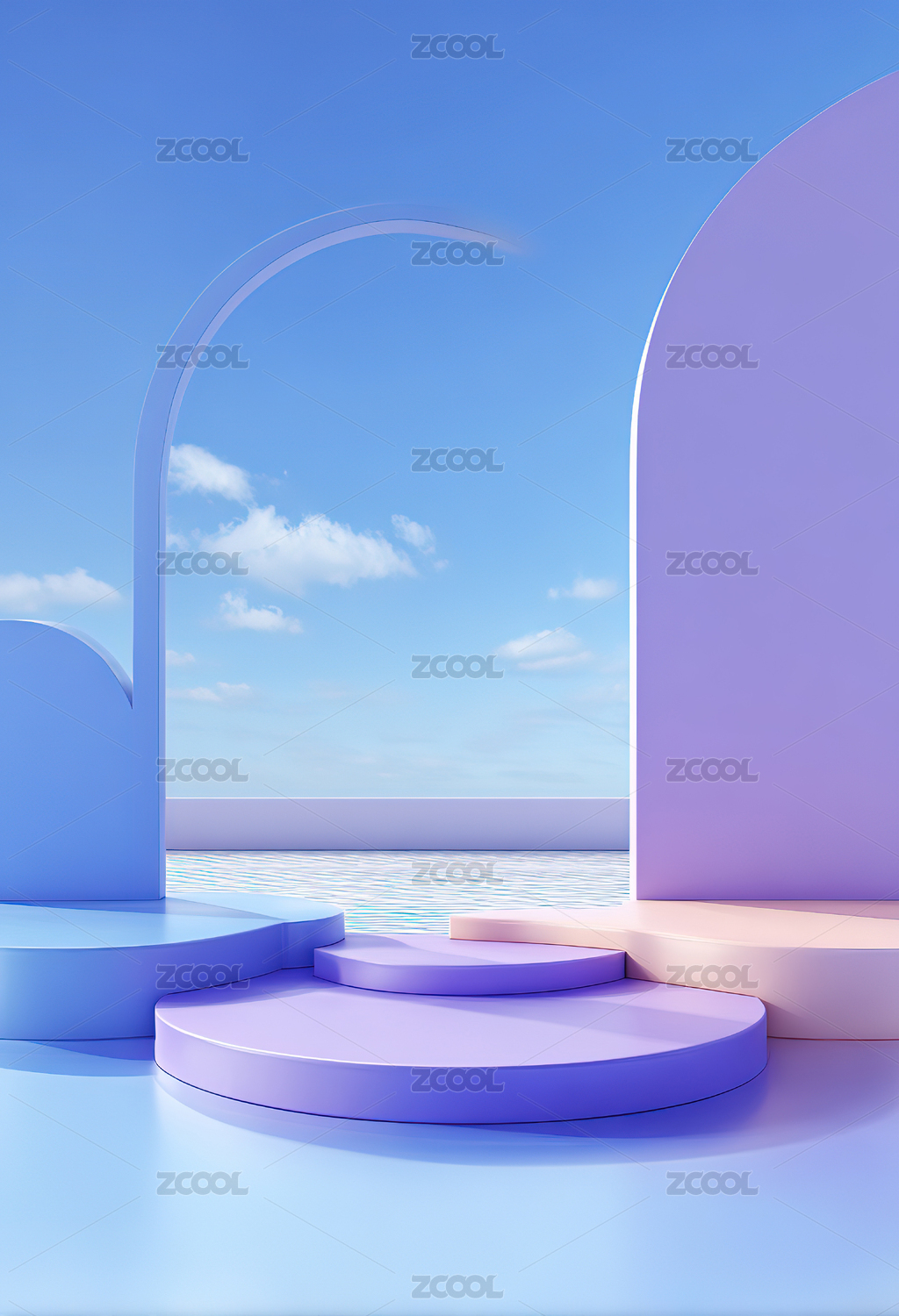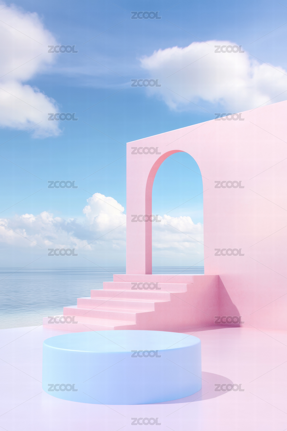 海边,舞台,几何,天空,云朵,蓝色,粉色,现代,简约,拱门