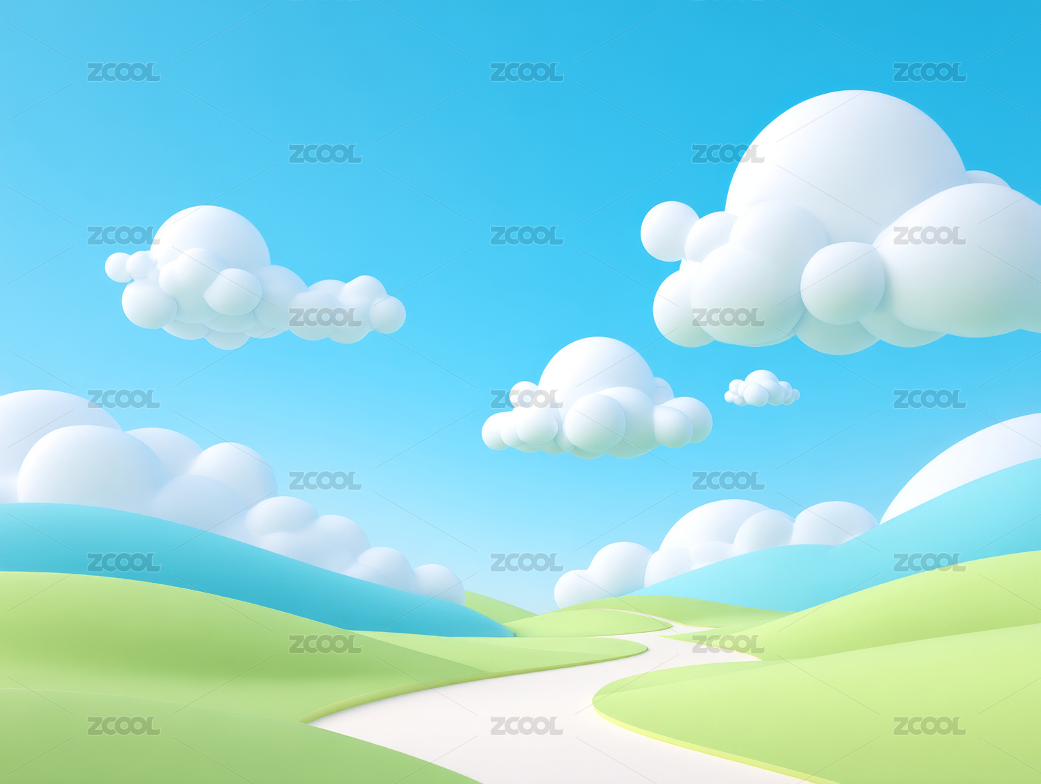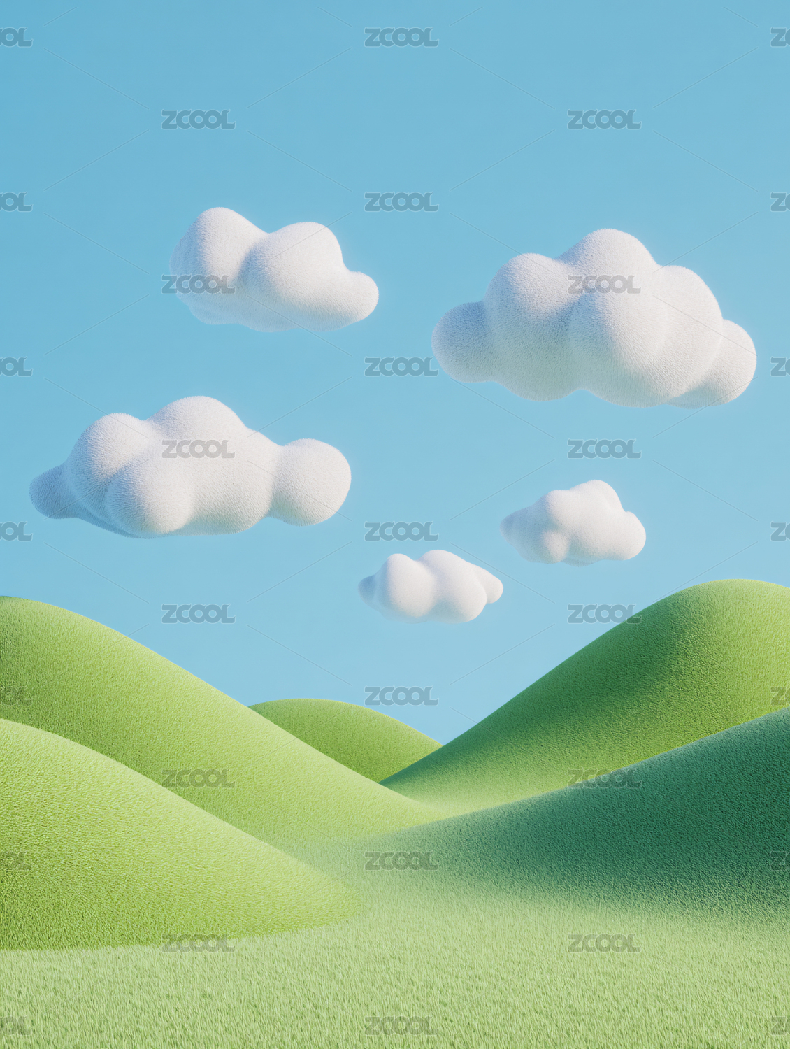 云朵,山丘,蓝天,绿地,梦幻,自然,风景,3D,清新,和谐