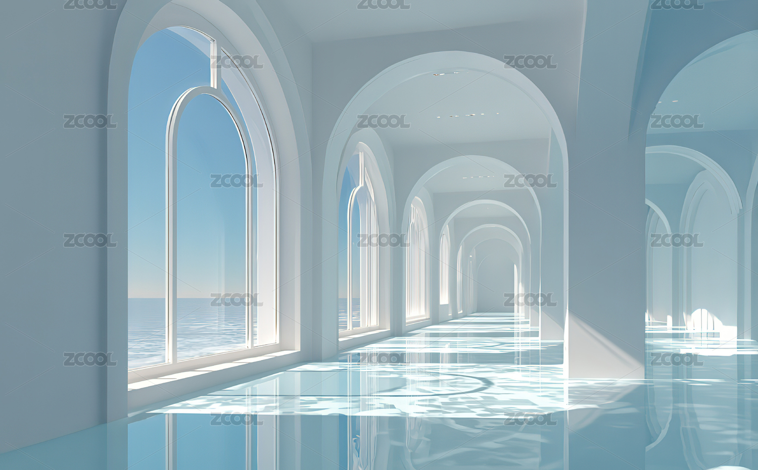 白色拱廊通向海洋的长廊