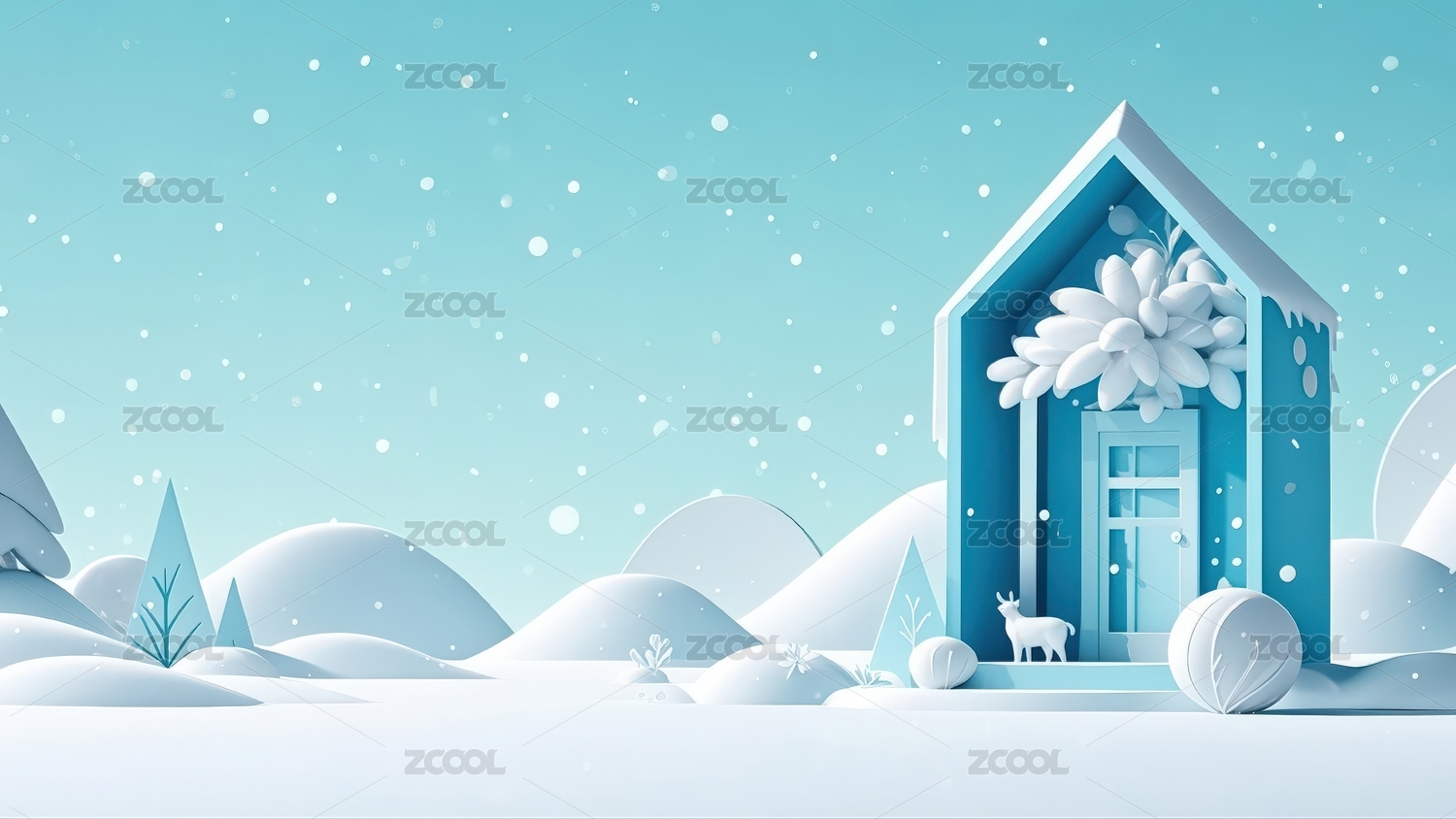山地森林河流房屋夜晚下雪的天空雪景背景