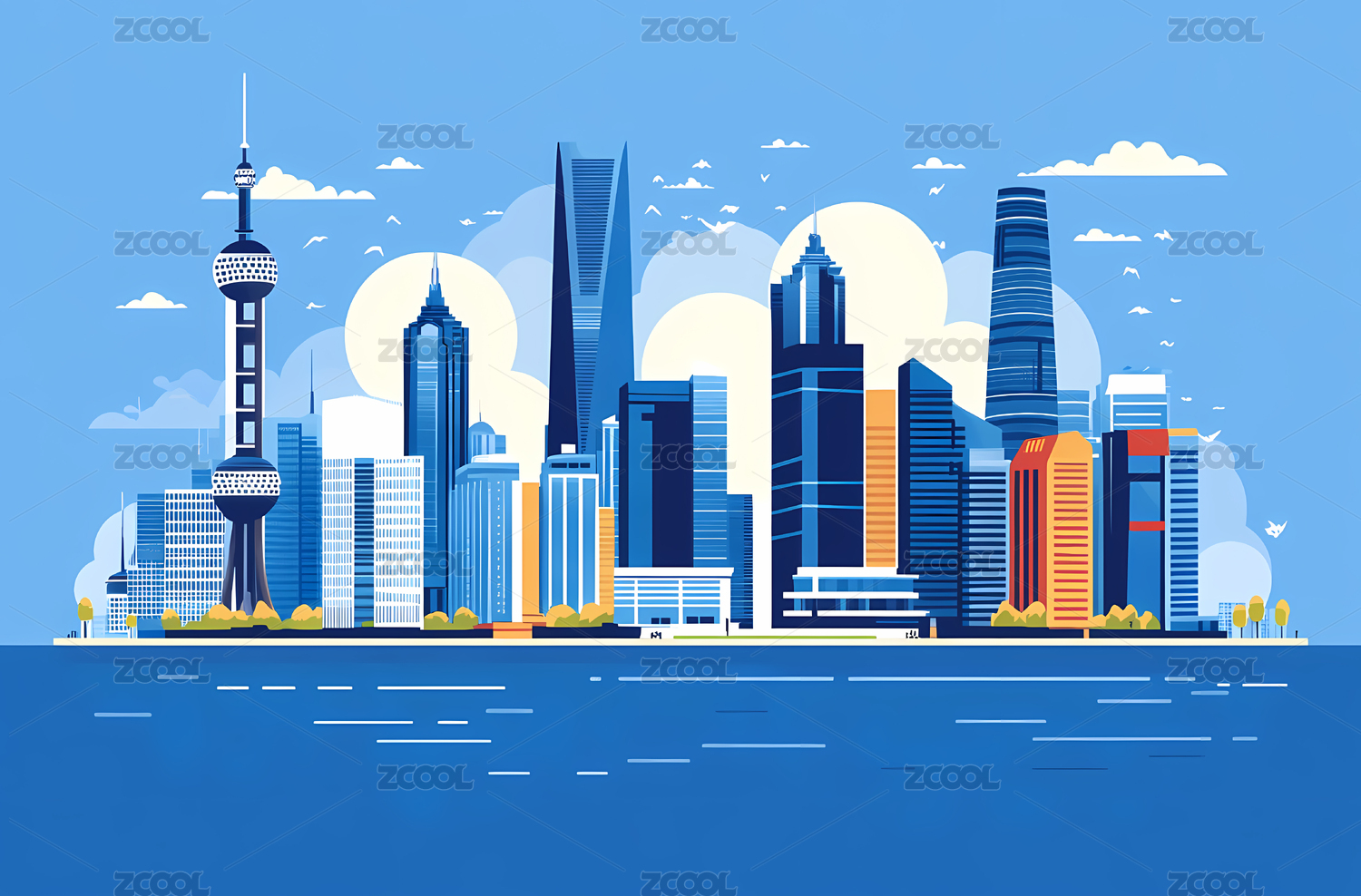 中国上海陆家嘴商务科技城市彩色天际线插画