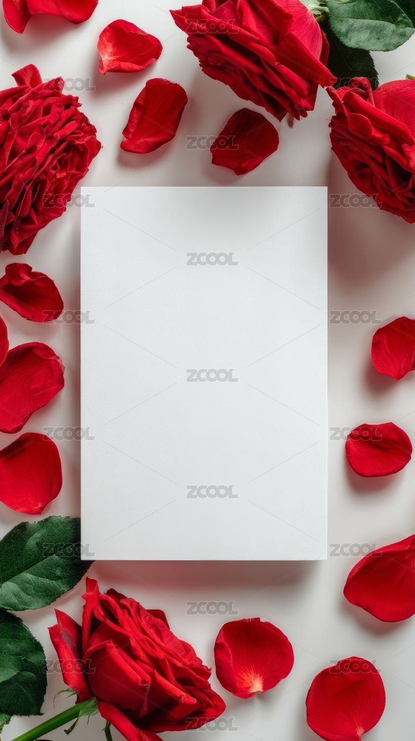 红玫瑰环绕的空白纸张