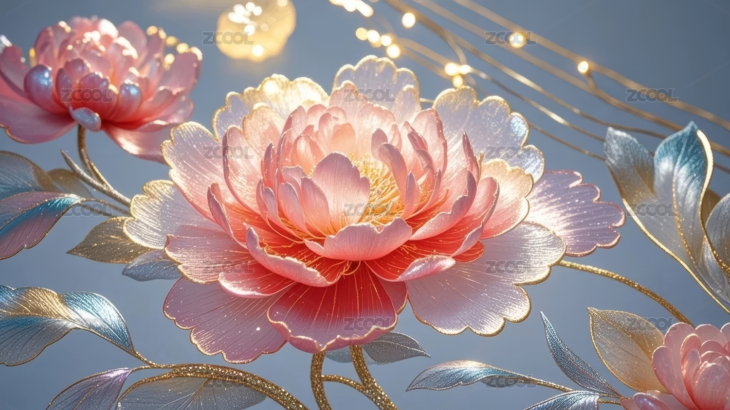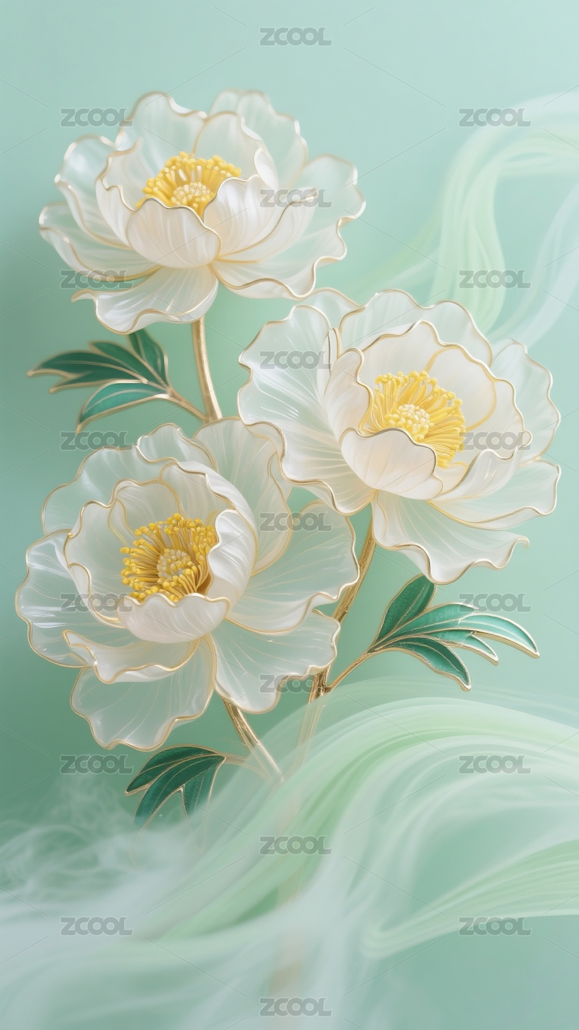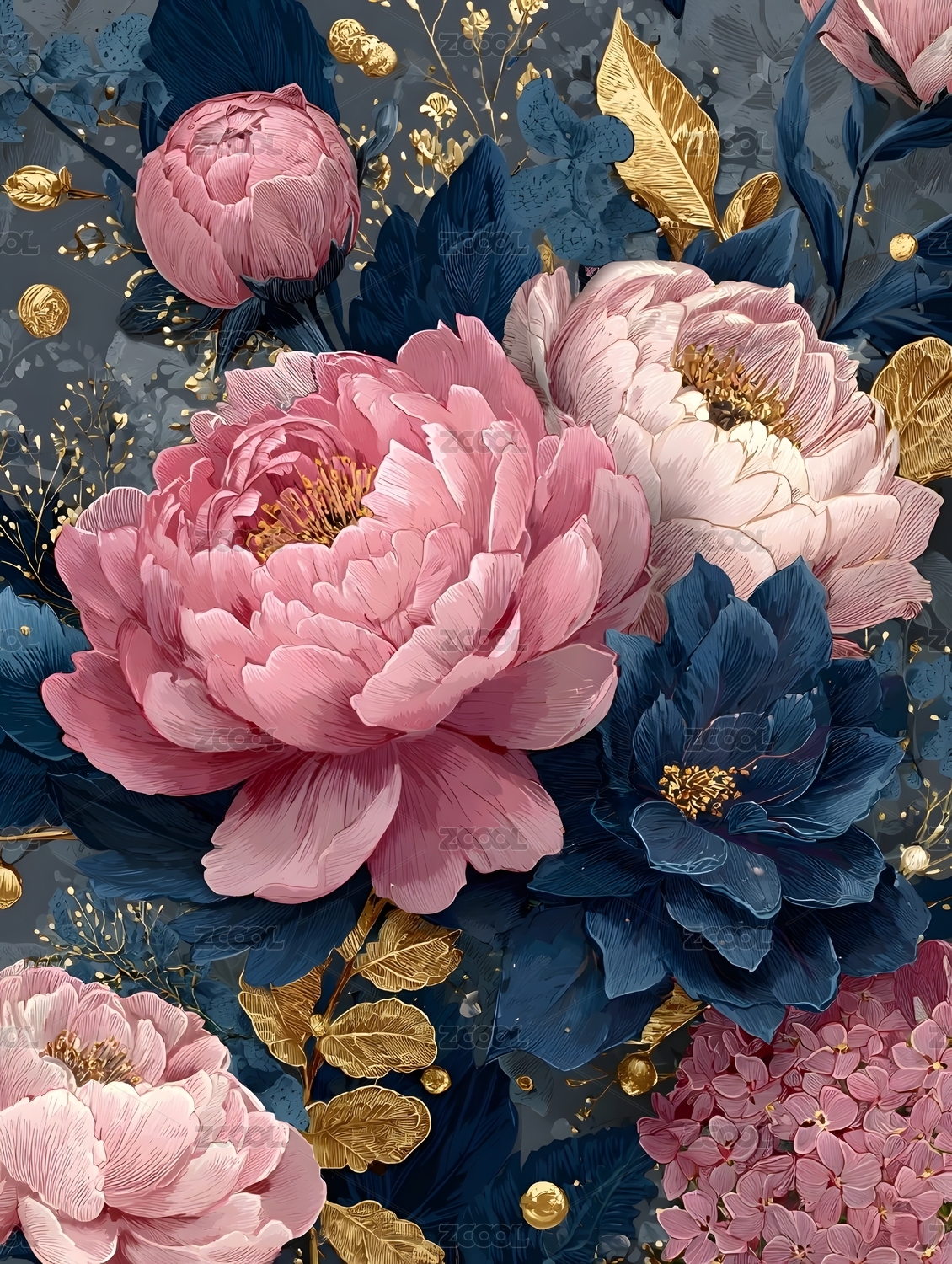 新中式水墨金箔岩彩牡丹花撞色水墨插画