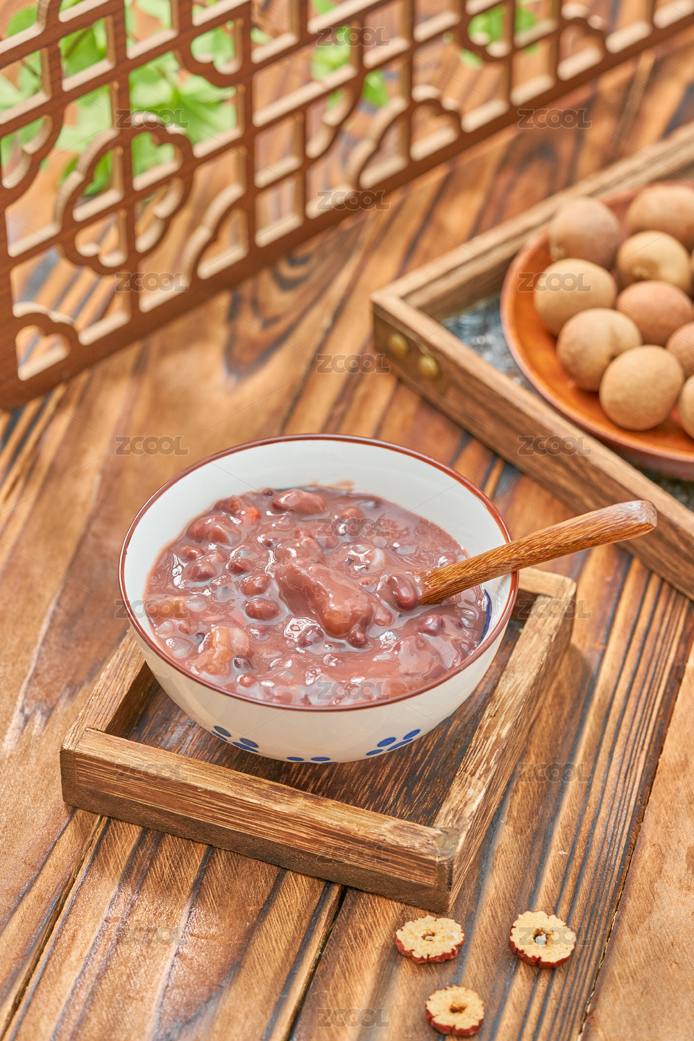 一碗红枣薏仁养生粥放在复古实木托盘里