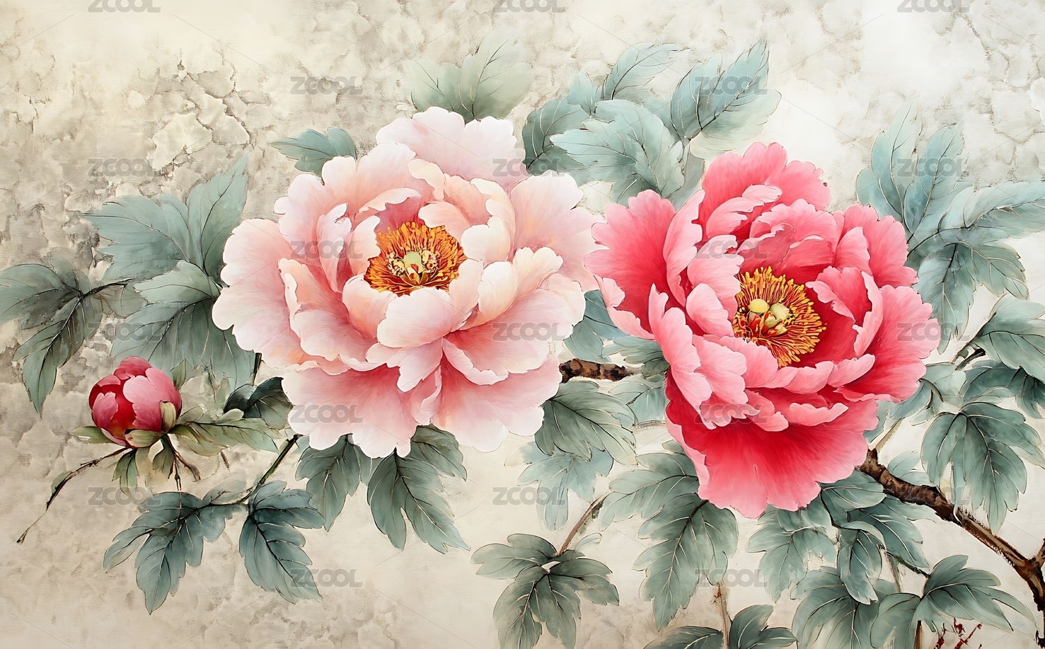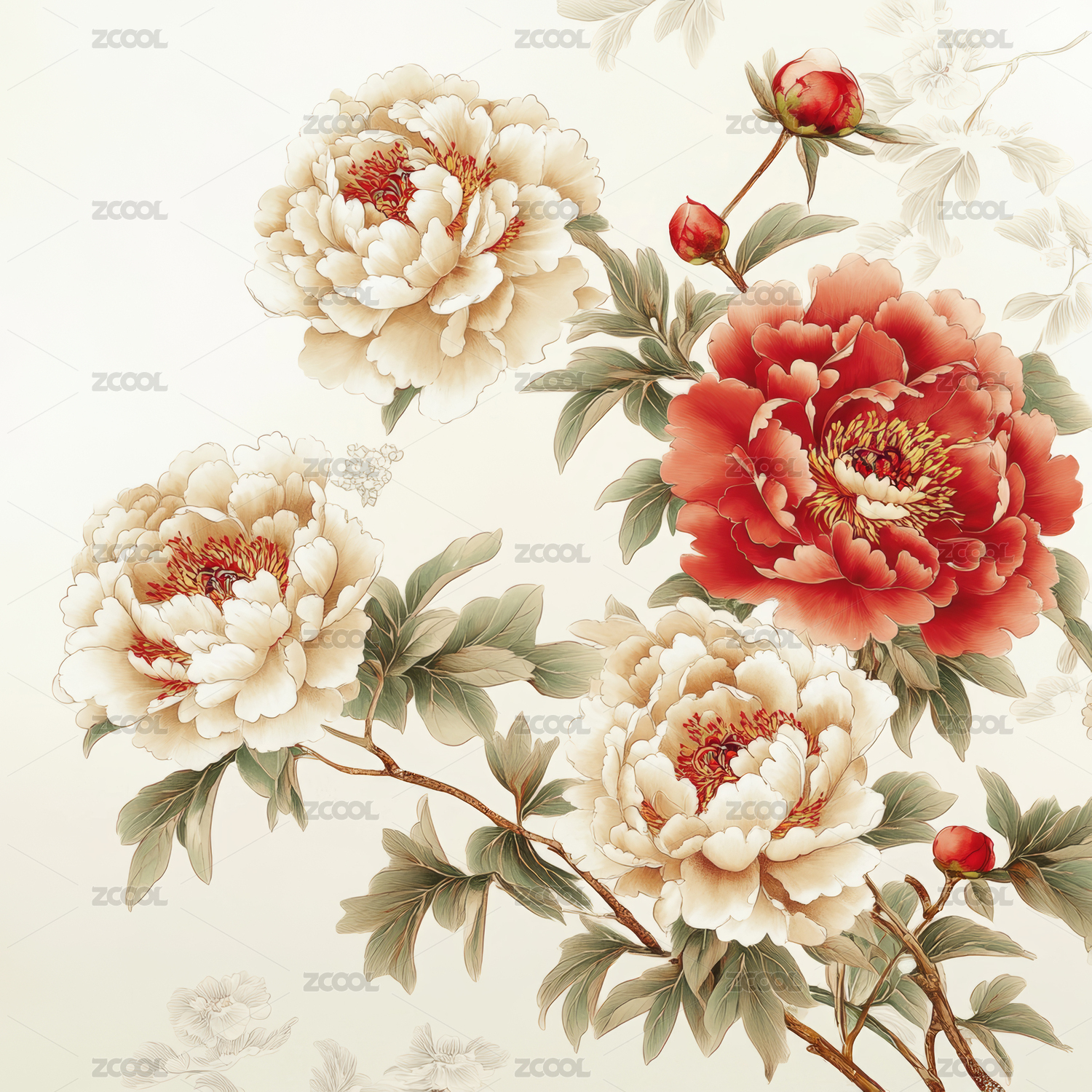 牡丹,国画,花卉,红色,白色,工笔画,水墨画,传统,吉祥,富贵