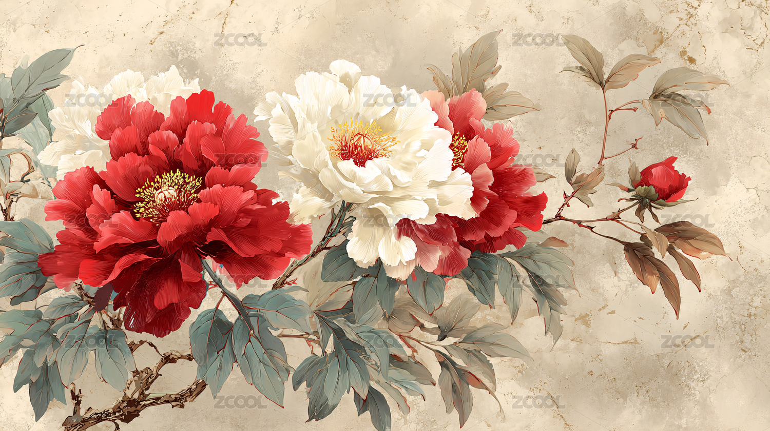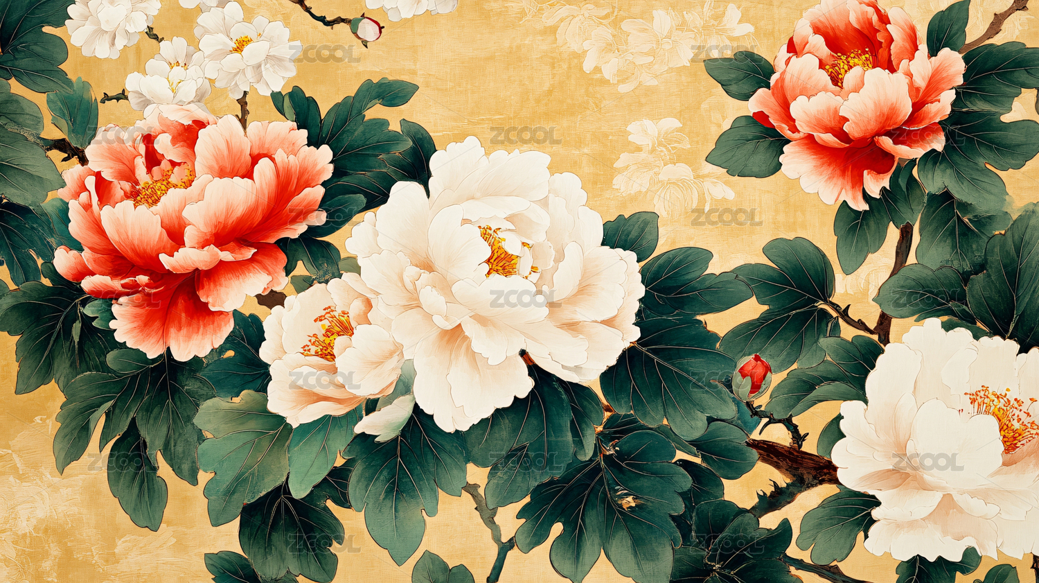金底上绽放的红白牡丹与绿叶