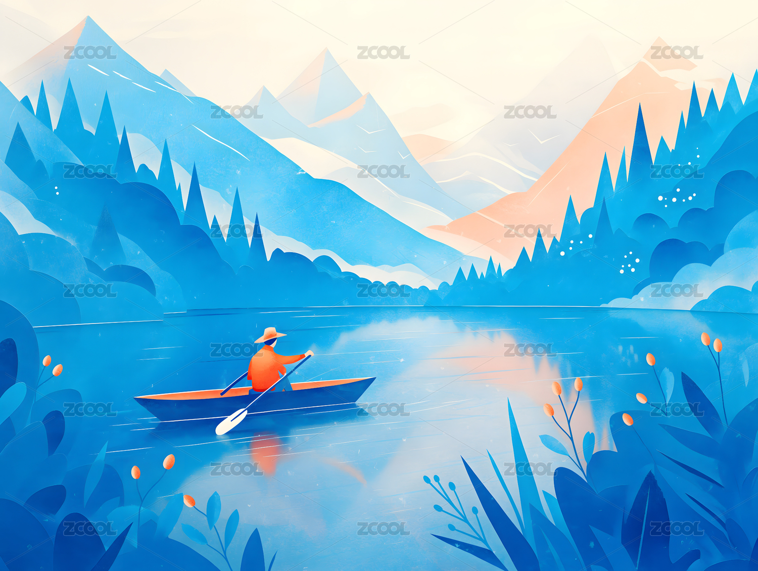 天空白云与山间平静的湖水插画