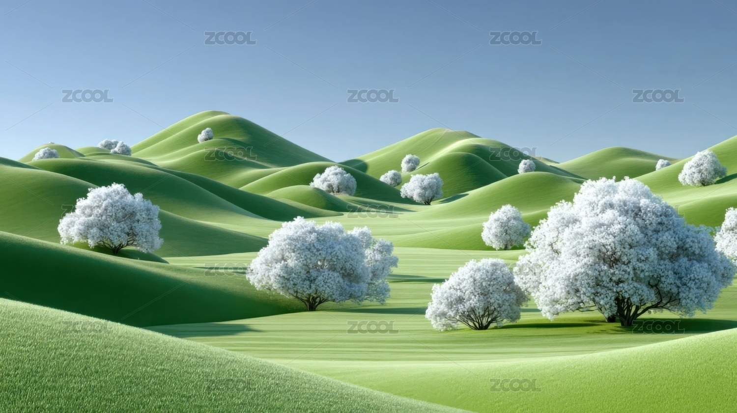 春天粉红色树绿色起伏山丘3D立体卡通插画