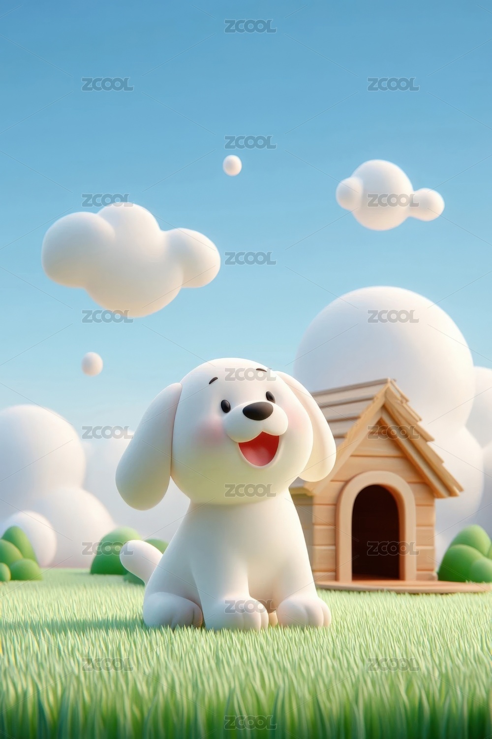 白天晴天绿色原野的宠物狗3D立体卡通插画